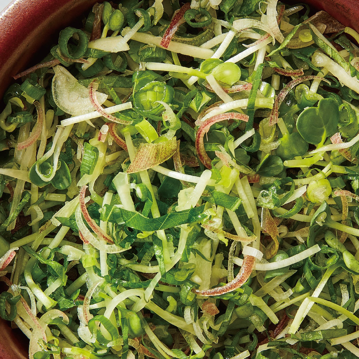 「分とく山」の叩き薬味は、様々な料理に使える万能薬味として考案された特別な合わせ薬味です。青じそ、茗荷、万能ネギ、貝割れ大根、生姜等を刻んで合わせたもので、これらを合わせることで、より奥深い味わいが生まれます。