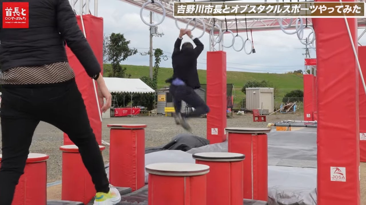 吉野川市長・原井敬氏が自ら地元の魅力をアピールすべく、YouTube番組『首長と○○やってみた』でオブスタクルスポーツで大跳躍!?