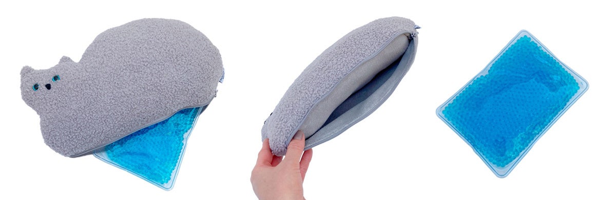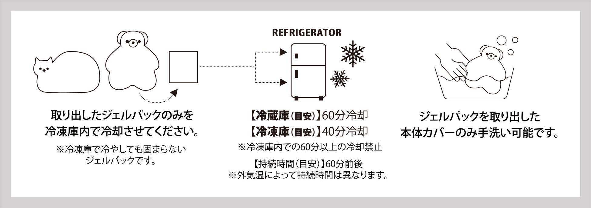 冷やしても固まらないので、顔まわりを冷やしたり枕にしても固さが気になりません。ジェルパックは使い捨てではなく繰り返し冷却可能なエコタイプ。クマとネコのカバーは手洗いできるので、清潔にお使いいただけます。