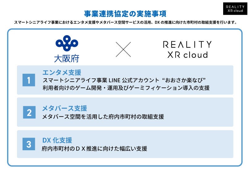 この度、大阪府が進めるスマートシニアライフ事業LINE公式アカウント「おおさか楽なび」をはじめとするスマートシティの取り組みにあたり、REALITY XR cloudが強みを持つエンタメ分野、メタバース分野、DX分野などで相互に連携協力し、大阪府民の生活の質(QoL)の向上を図るため、スマートシティの推進に向けた協定を締結することとなりました。今回合意した協定内容は以下の4点になります。