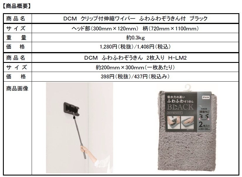 全国でホームセンター事業を展開するDCM株式会社 東京都品川区、代表取締役社長: 石黒靖規以下、DCM)は、ご家庭にあるぞうきんや、市販のフローリングシートも使用できる「DCM クリップ付伸縮ワイパー ふわふわぞうきん付 ブラック」を 2022 年 12 月 2 日(金)より全国のDCM・ケーヨーデイツー店舗一部店舗を除く)にて発売します。