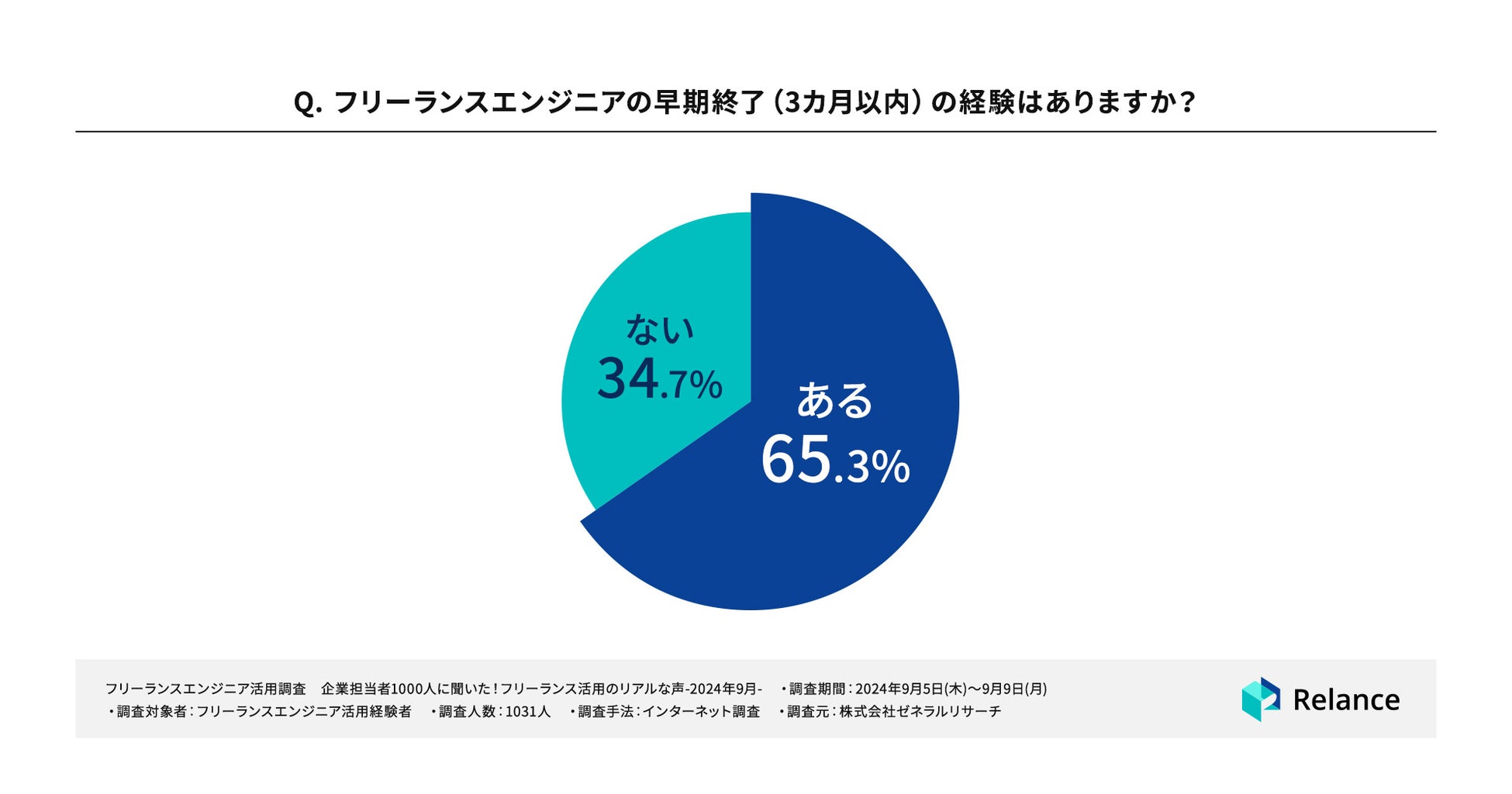 「フリーランスエンジニアの早期終了(3カ月以内)の経験はありますか?」という設問に対して「ある」と回答した方が約65.3%、「ない」と回答した方が約34.7%と、半数以上が早期終了の経験をしていることがわかりました。