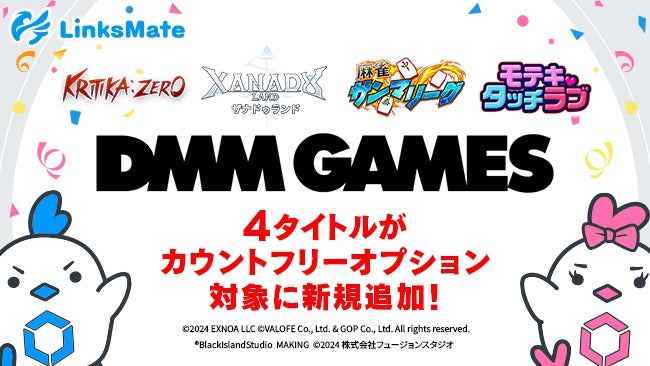 株式会社LogicLinks(以下LogicLinks、本社:東京都渋谷区、代表取締役社長:春田康一)は、MVNOサービス「LinksMate」において2024年9月19日(木)よりカウントフリーオプション対象コンテンツとして合同会社EXNOA(本社:東京都港区、CEO:村中 悠介)が提供するオンラインゲームプラットフォーム『DMM GAMES』にて配信中の「KRITIKA:ZERO」、「Xanadu Land」、「麻雀サンマリーグ」、「モテキ・タッチラブ」を新たに追加することをお知らせいたします。