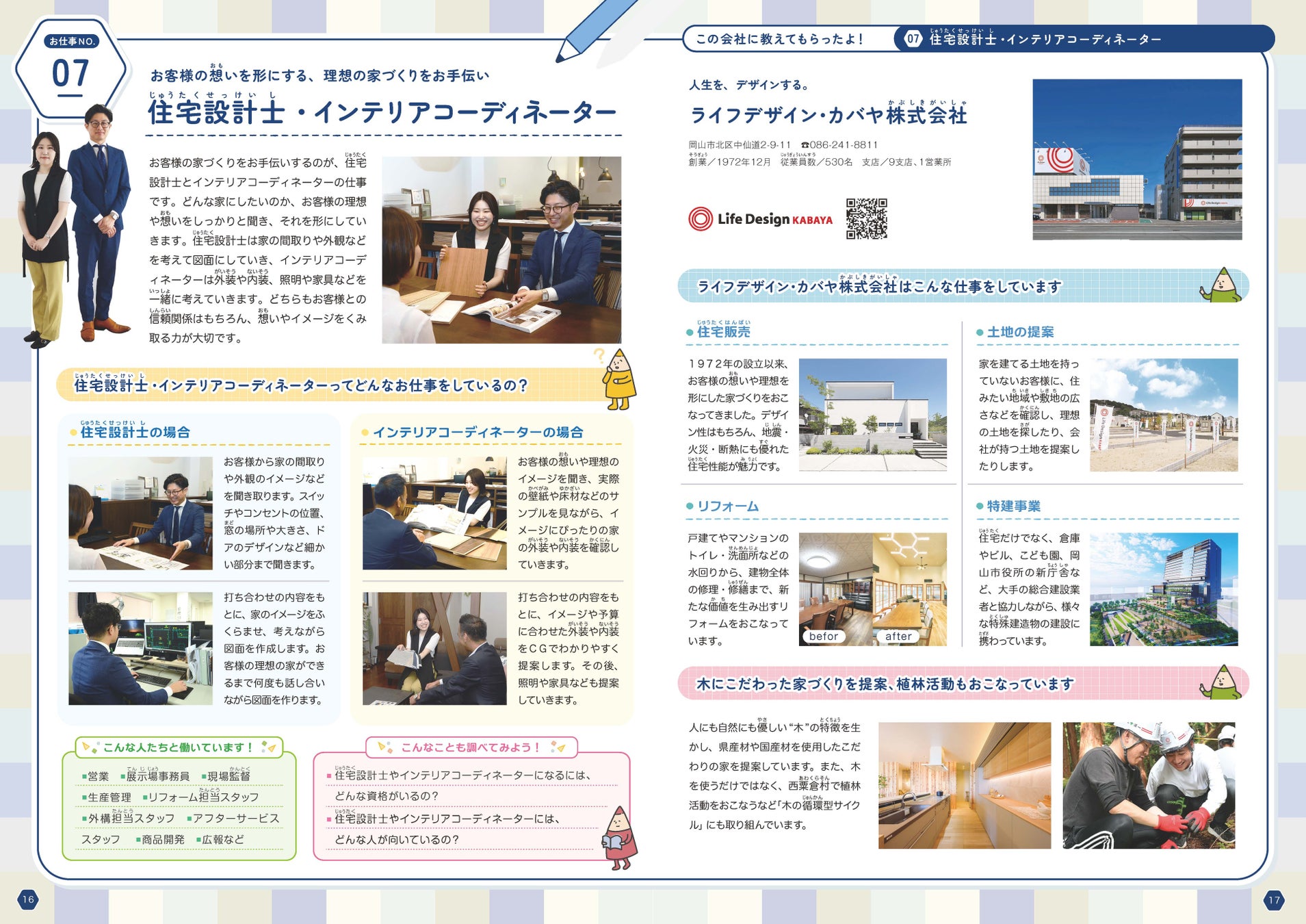 岡山放送株式会社が発行する小学生向けのキャリア教育教材となっており、10 年先のビジョンを見据え、地域の未来の担い手である子供たち、特にキャリア教育を始める岡山・香川両県内の小学5年生約24,000人全員に、県内の職種を知ってもらうために、岡山県、香川県の2県にて今回初めて発行されました。当社は企画に賛同し、「岡山県のおしごと本」にて住宅設計士・インテリアコーディネーターの仕事について紹介しています。