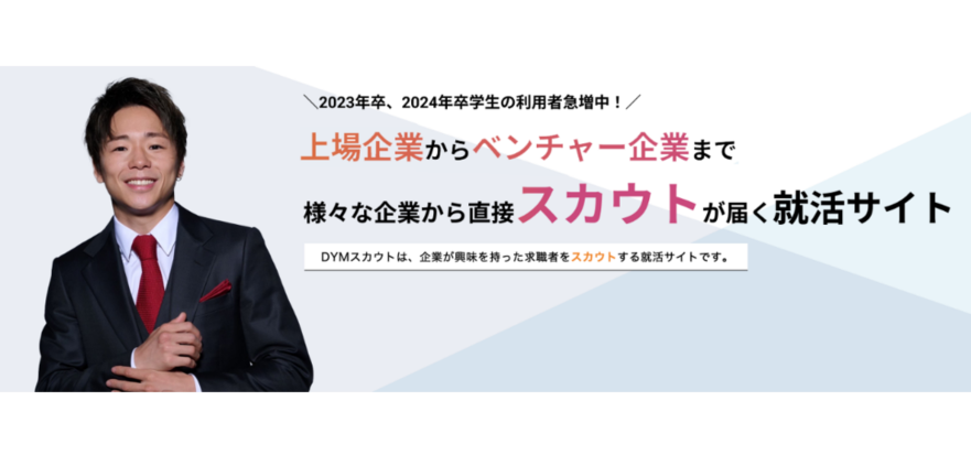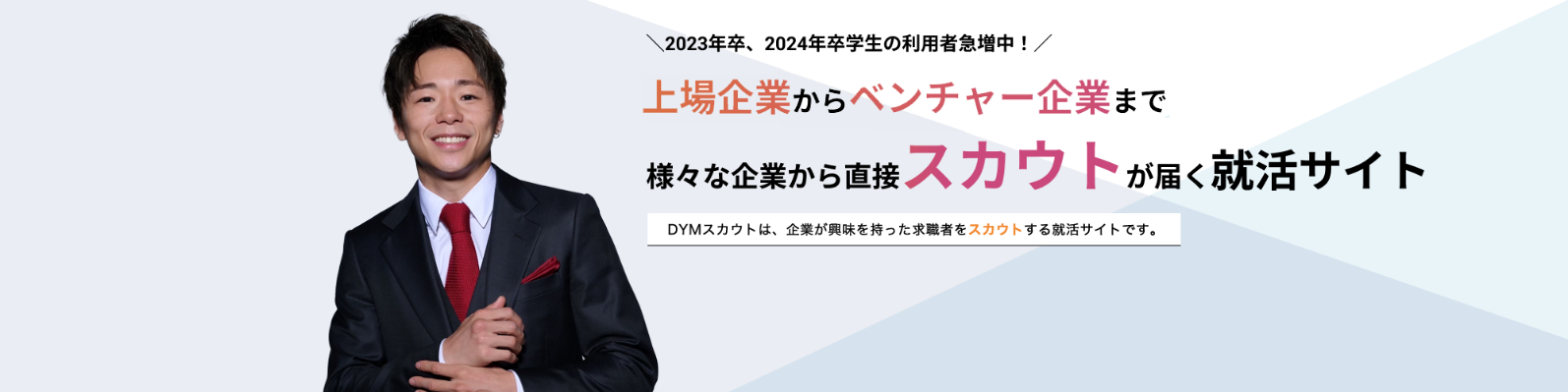 DYM スカウトは、登録学生の中から企業が採用対象とする新卒学生に直接アプローチすることができるダイレクトリクルーティングサービスです。2022年5月時点で、2023年度卒業予定の登録学生約11万人に対して直接スカウトを送付し、アプローチすることが可能です。市場が前年から約130%成長、また5年連続で市場規模を拡大するなかで、DYM スカウトはイベント・紹介と合わせて包括的かつ多様な接点を作り、企業様の採用活動を支援しております。