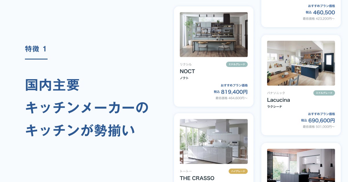リクシル、クリナップ、TOTO、パナソニック、トクラスの人気のキッチンをラインナップ。シリーズやオプションを選択してプランを保存することで、かんたんに比較しながらキッチンを選ぶことができます。