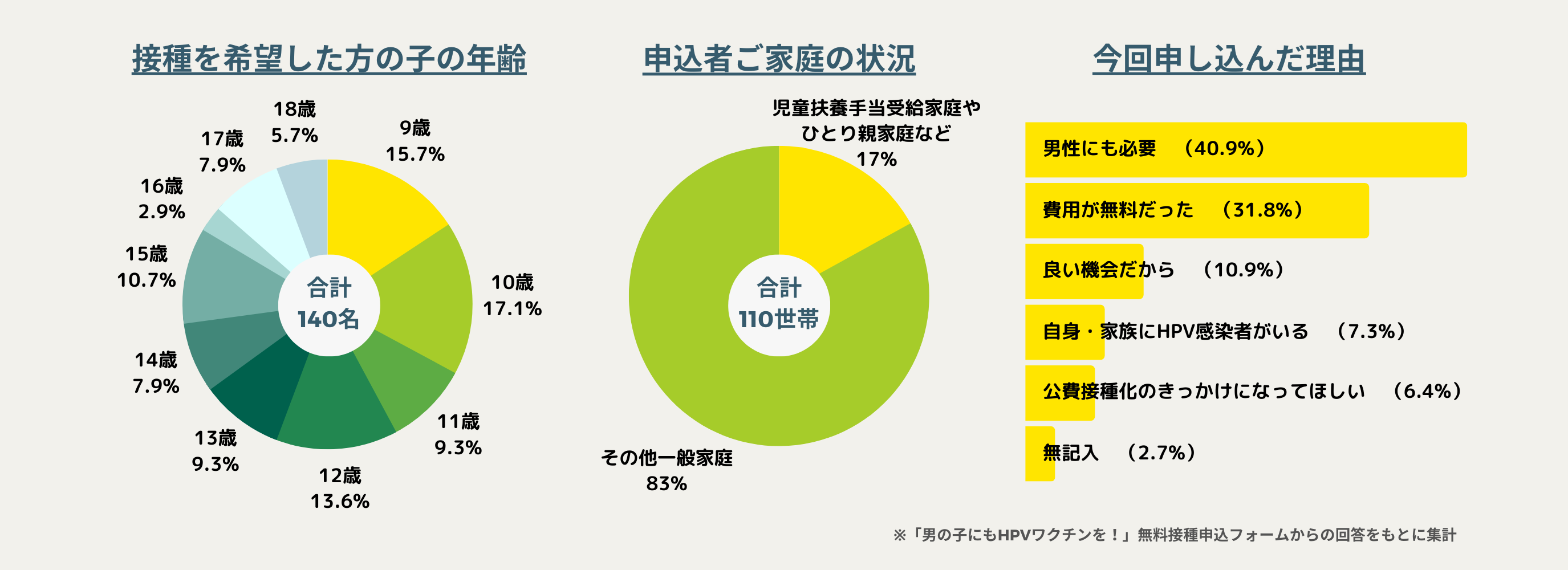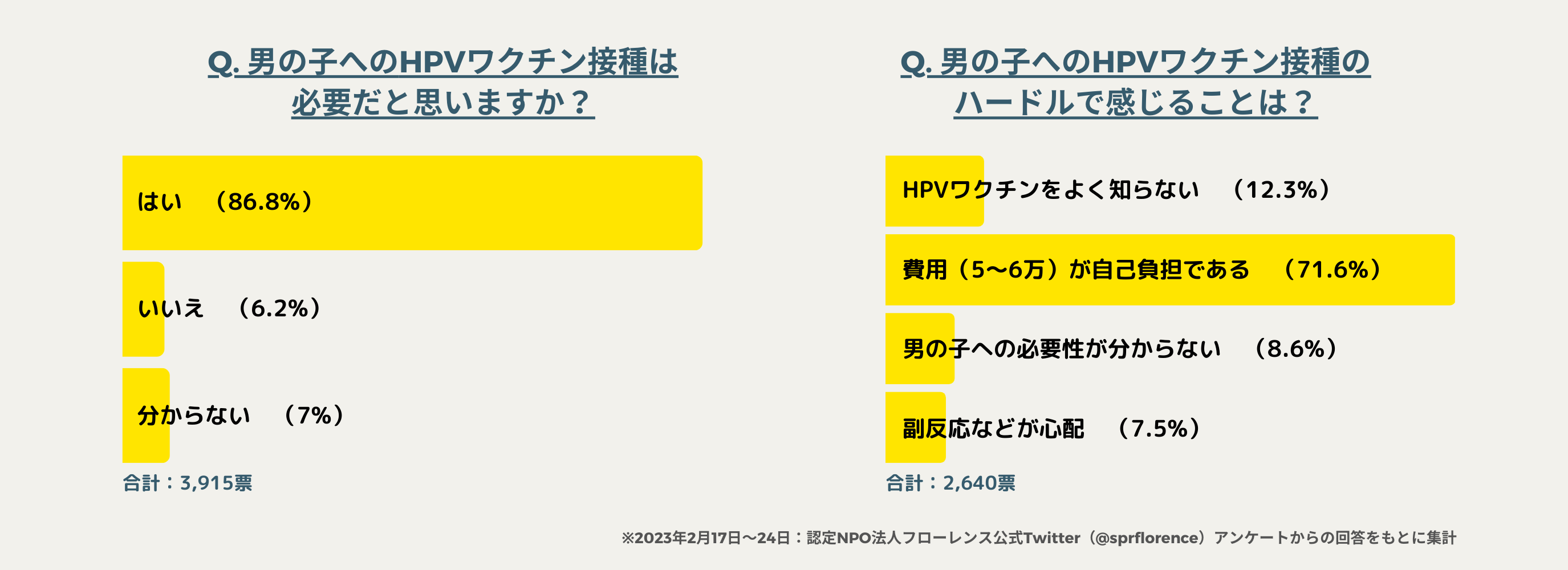国内最大規模の子ども・子育て支援団体「認定NPO法人フローレンス」グループと、医療関係者などによる「HPVについての情報を広く発信する会(通称:みんパピ!)」は、1月23日より『男の子にもHPVワクチンを!』ソーシャルアクションを実施しています。HPVワクチンの男性への公費接種化を訴えるため、18歳以下の男性60名に無料接種を提供しているほか、3月4日「国際HPV啓発デー」に合わせ、男性へのHPVワクチン接種に関するアンケート結果を公開します。本アクションを通じHPVワクチンの男性への公費助成での接種ニーズが非常に高いことが分かりました。実際に接種を申し込んだご家庭の声も含め、以下にデータをまとめています。