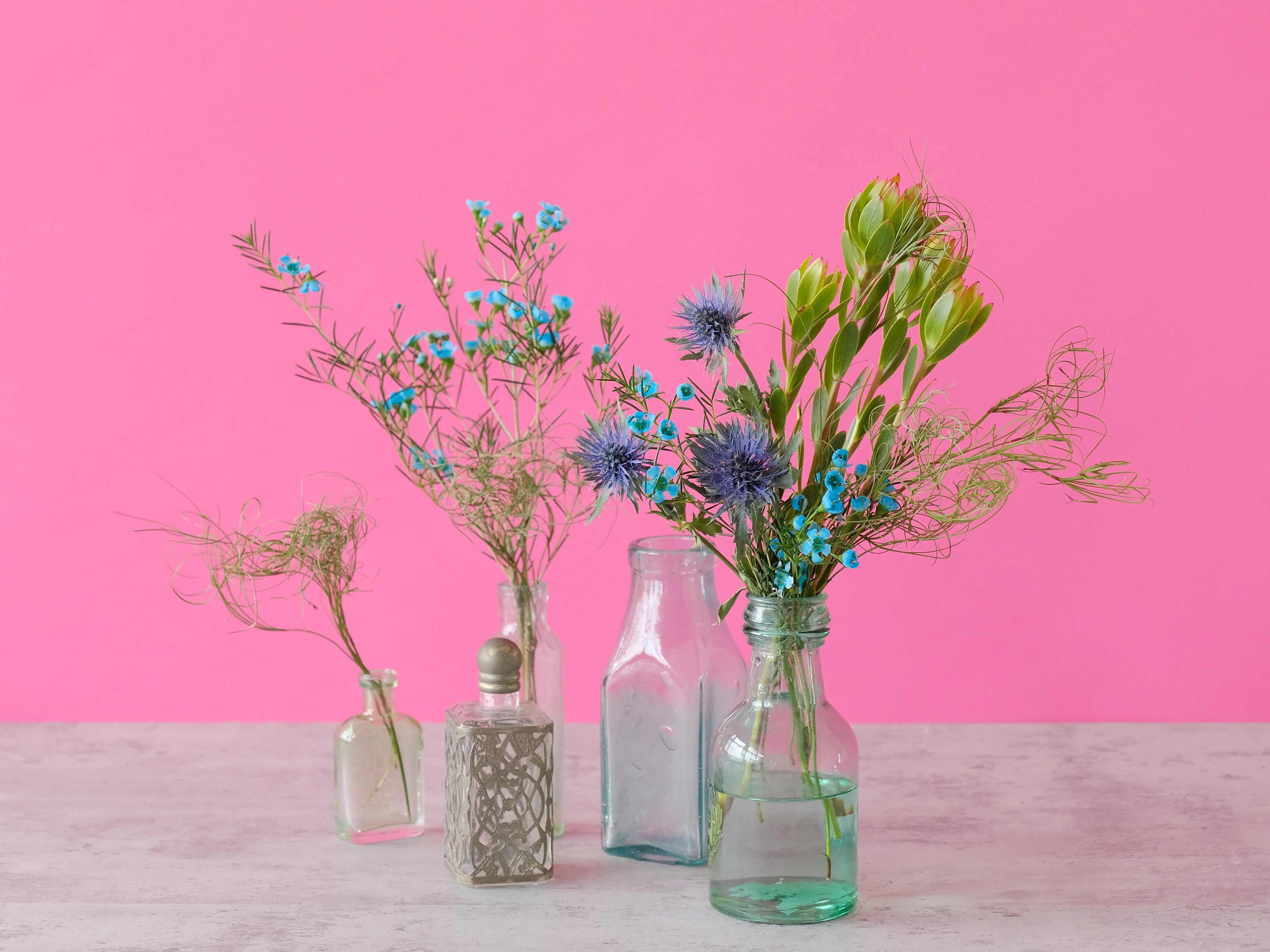 右上:ブーケを小瓶に分けて。持ち運びも楽なので、リビングやダイニング、寝室など、人が集まるタイミングで場所を移動して飾ることができます。