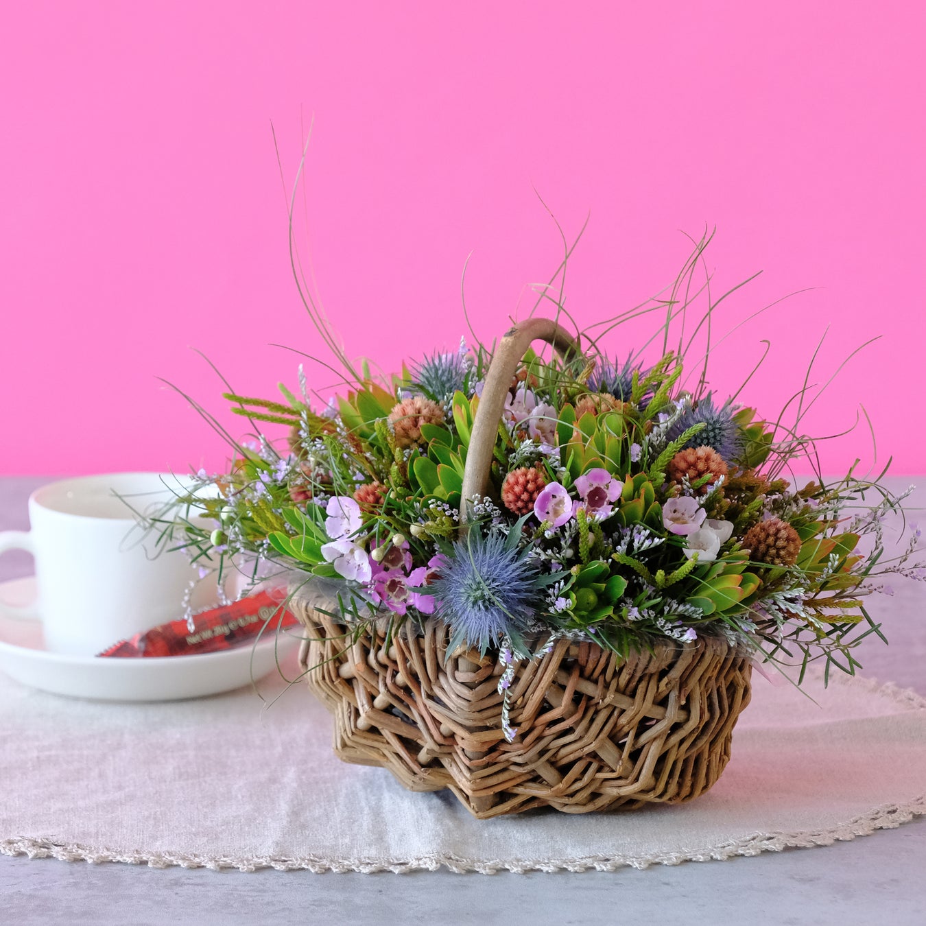 ショップおすすめのネイティブフラワーをナチュラルなアレンジメントに仕上げました。器付きでそのまま飾って楽しめるので、ハロウィンギフトにもおすすめです。