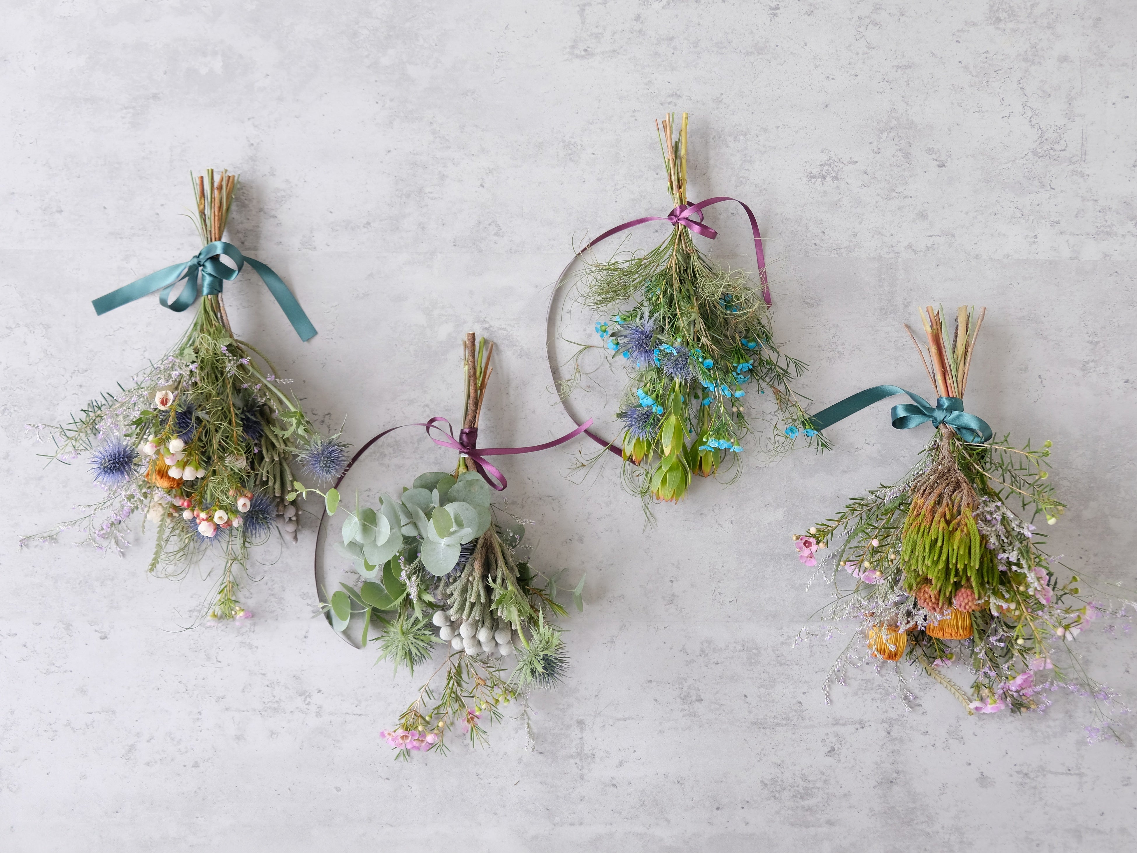 左下:ネイティブフラワーはドライフラワーに向いたものが多いことも特徴のひとつ。インテリアにもぴったりなスワッグなど、簡単にドライフラワーを作ることができます。