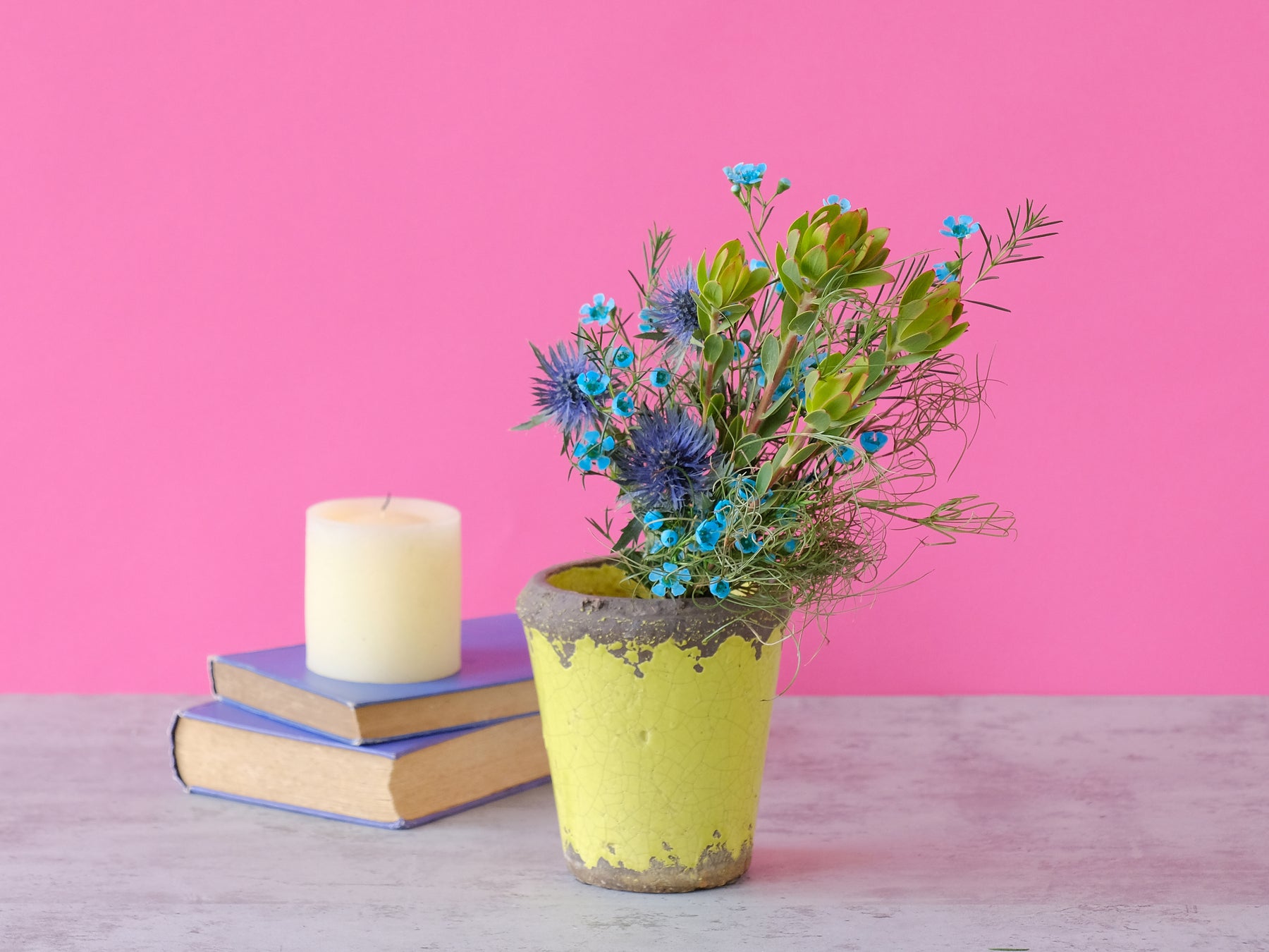 左上:ブルーの花々に黄色の花器を合わせました。反対色をあわせるとメリハリの効いた元気なイメージに仕上がります。