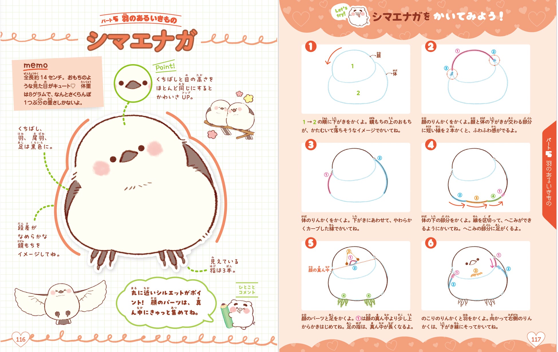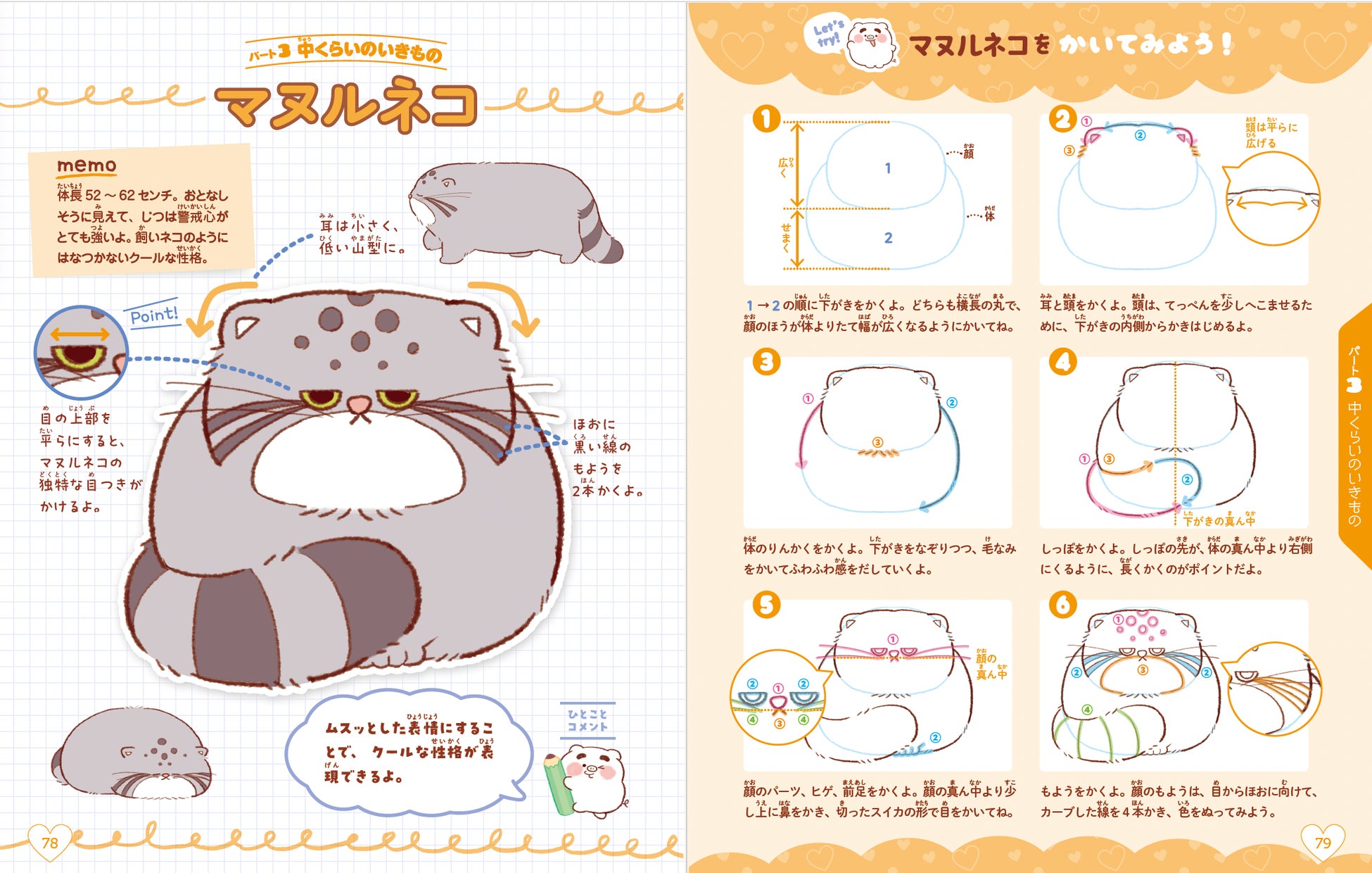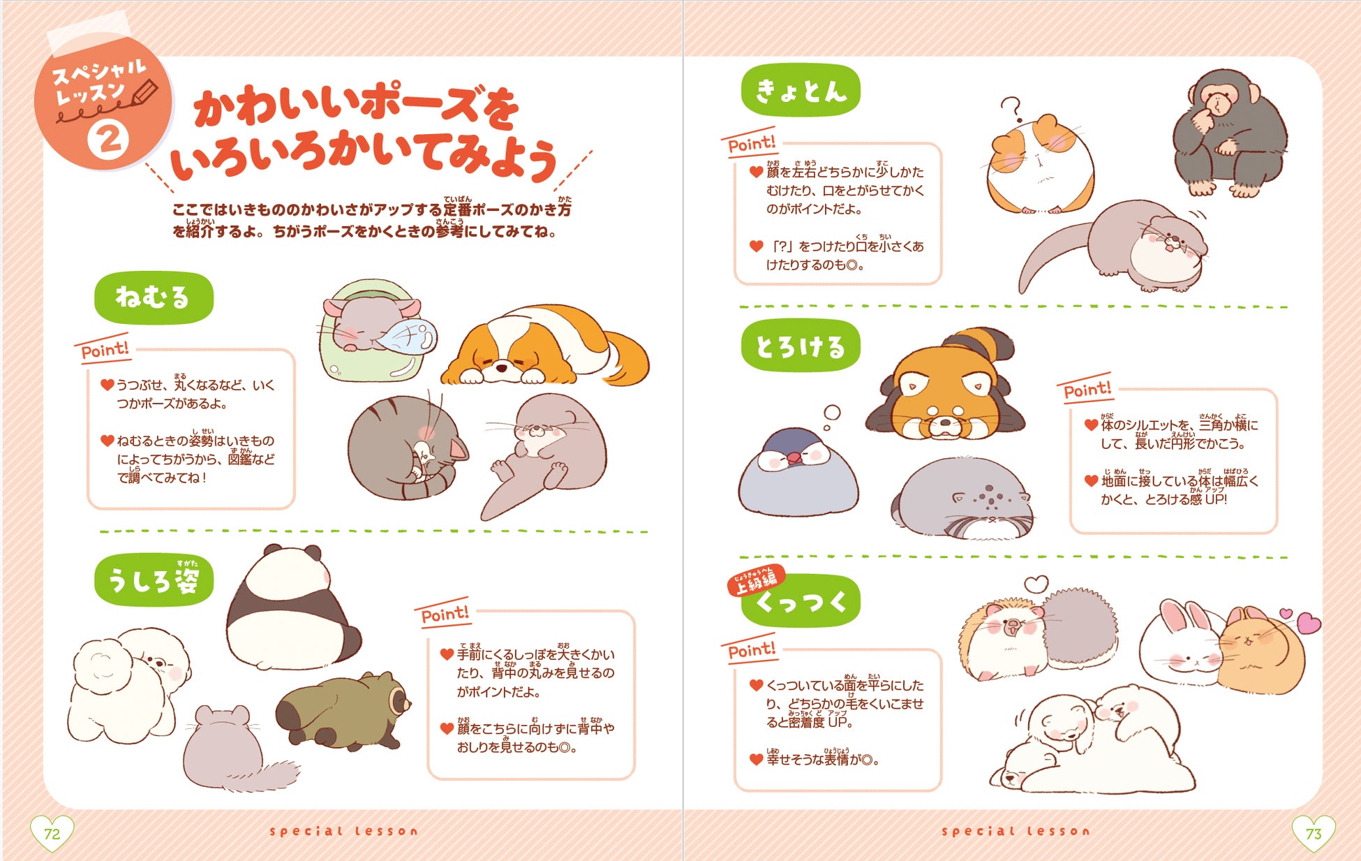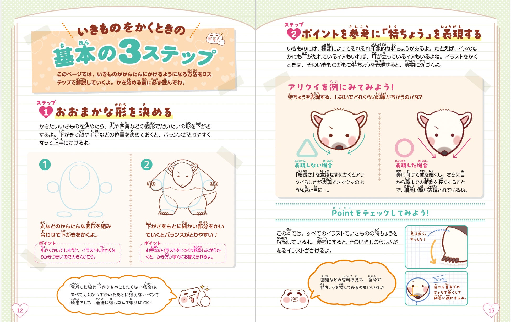 ただかわいいだけじゃなく、今にも動き出しそうな躍動感のあるイラストにするためのコツや、表現したほうがより生き生きとするいきものの特徴なども解説しているので、誰でもマネするだけでいきものイラストの達人に!