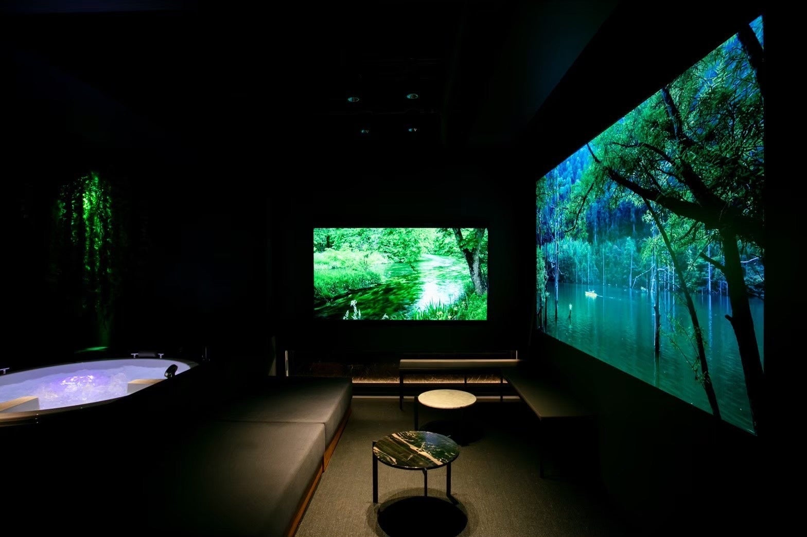 高級感漂うサウナラウンジに没入感のあるLEDビジョン