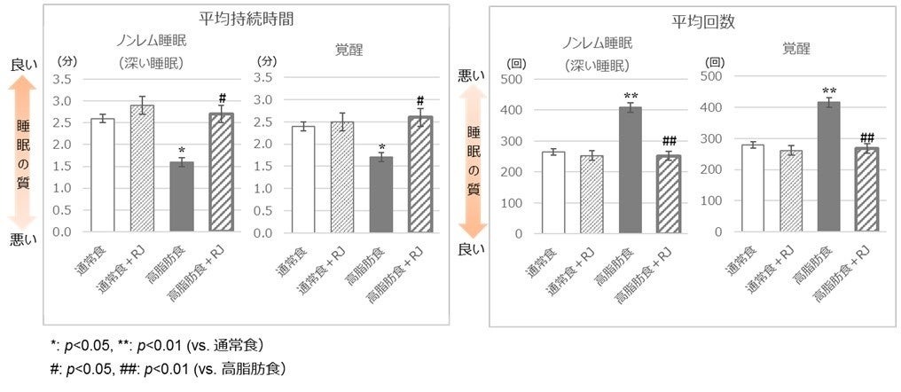 高脂肪食群では通常食群よりも、ノンレム睡眠と覚醒の持続時間が短く、回数が多くなり、睡眠の断片化が進行しました。一方で、高脂肪食+RJ群では、それらの睡眠の断片化が抑制され、睡眠の質が改善しました。