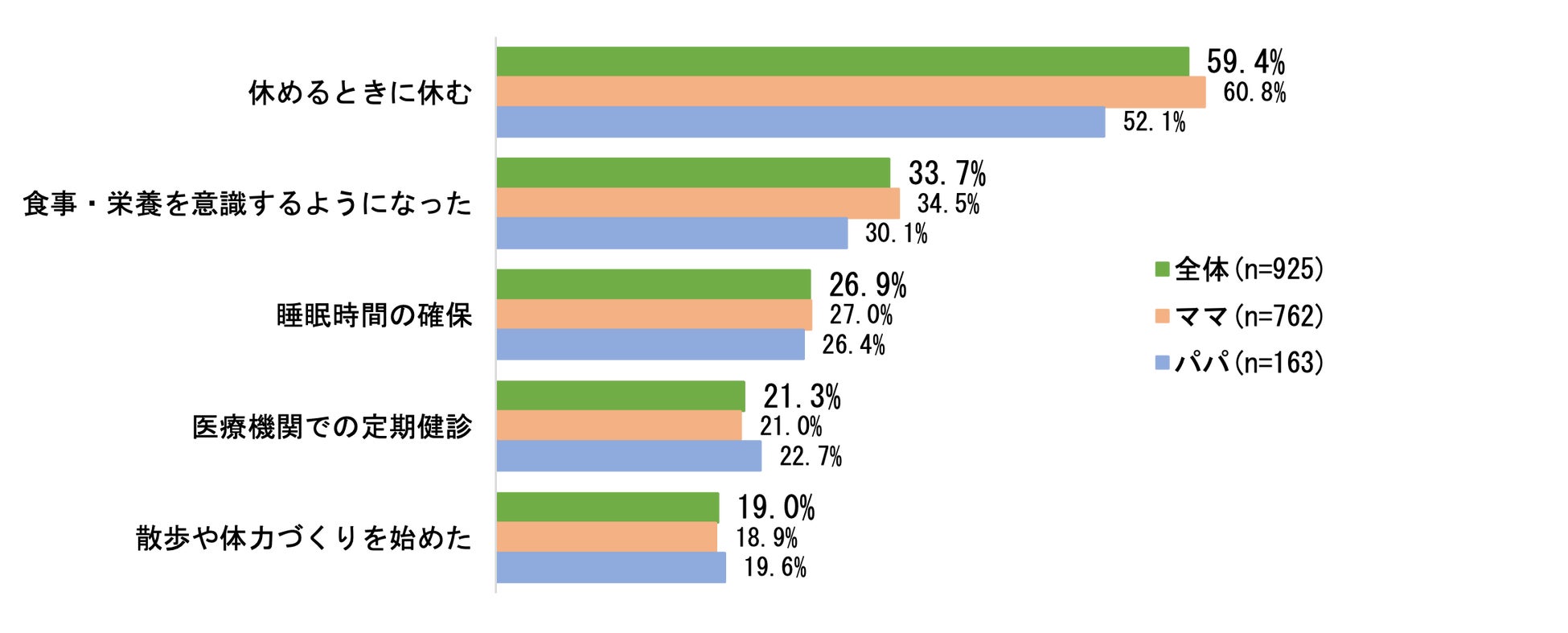 「トモイク」の浸透による「体の負担軽減=健康」についてはどうでしょうか。今回、子育てを通じて約8割(79.6%)が「ウェルビーイング(心と生活の幸福感)が高まった」と回答しました。しかしながら現状、「健康(食事・運動・睡眠)」に関しては32.4%が「子ども優先でおろそかになった」と感じ、特にママはパパよりも7.3ポイント高い3人に1人(33.7%)がご自身の健康よりも“子育てファースト”になりがちな傾向が伺えました。その中でもママ60.8%・パパ52.1%ともに「休めるときに休む」を意識して乗り切っているようです。