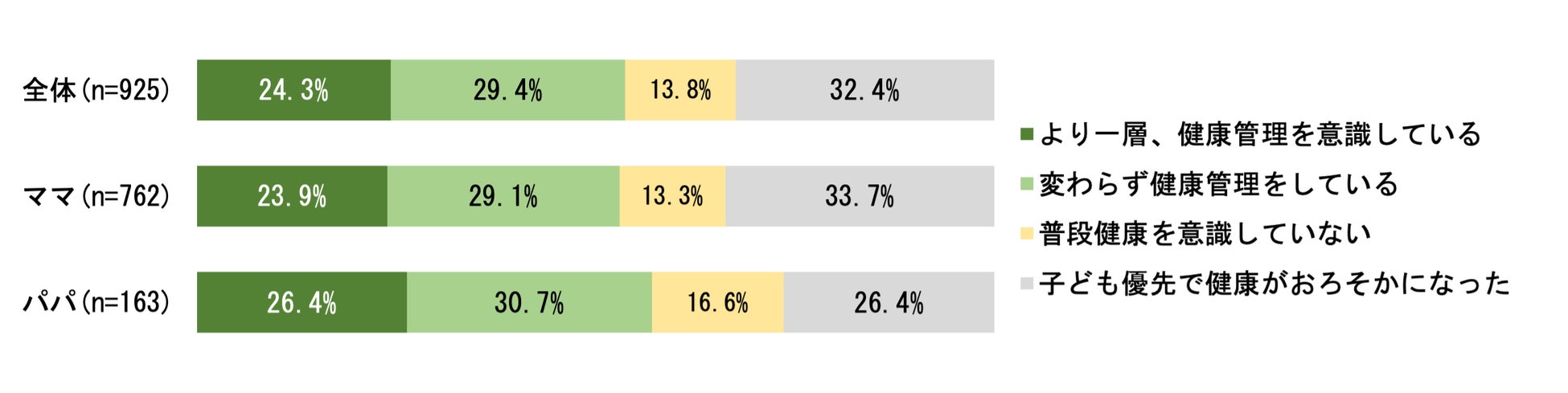 日々の時間を100%とした場合の「自分時間(趣味・社会とのつながり)」の割合(%)は「9.6%」しかなく、生活維持のための“活動時間”(「子育て・家事」52.9%「仕事」19.2%)は合計72.1%、「自分時間」を含めた「健康(食事・運動・睡眠)」に配慮した“充電時間”は合計27.9%。さらに「健康」に関しては32.4%が「子ども優先でおろそかになった」と子どもを最優先に考える実態がある一方で、ママ・パパ自身の健康が後回しにせざるを得ない実情が伺えた。