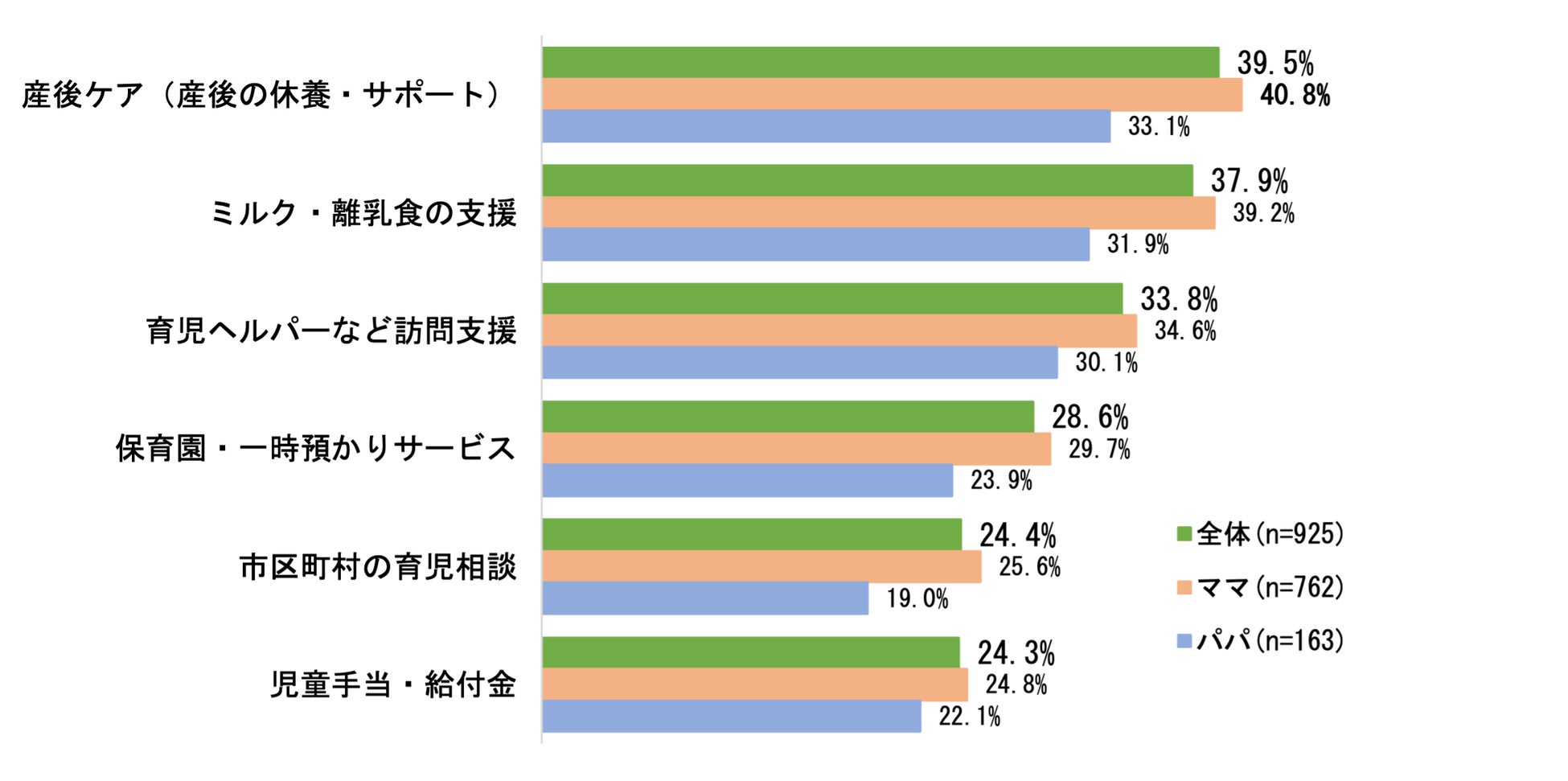 次に、社会からの子育て支援の観点から“愛情以外”に重要だと思う要素を聞いたところ、「体力」56.5%や「時間」54.2%を大きく引き離して、1位は「お金」77.5%という結果になりました。実際、パパの42.3%は「思ったより役に立った」支援として「児童手当・給付金」をトップに挙げています。ママからは「地域の子育て支援・子育て広場」が38.6%と高い数字になりました。