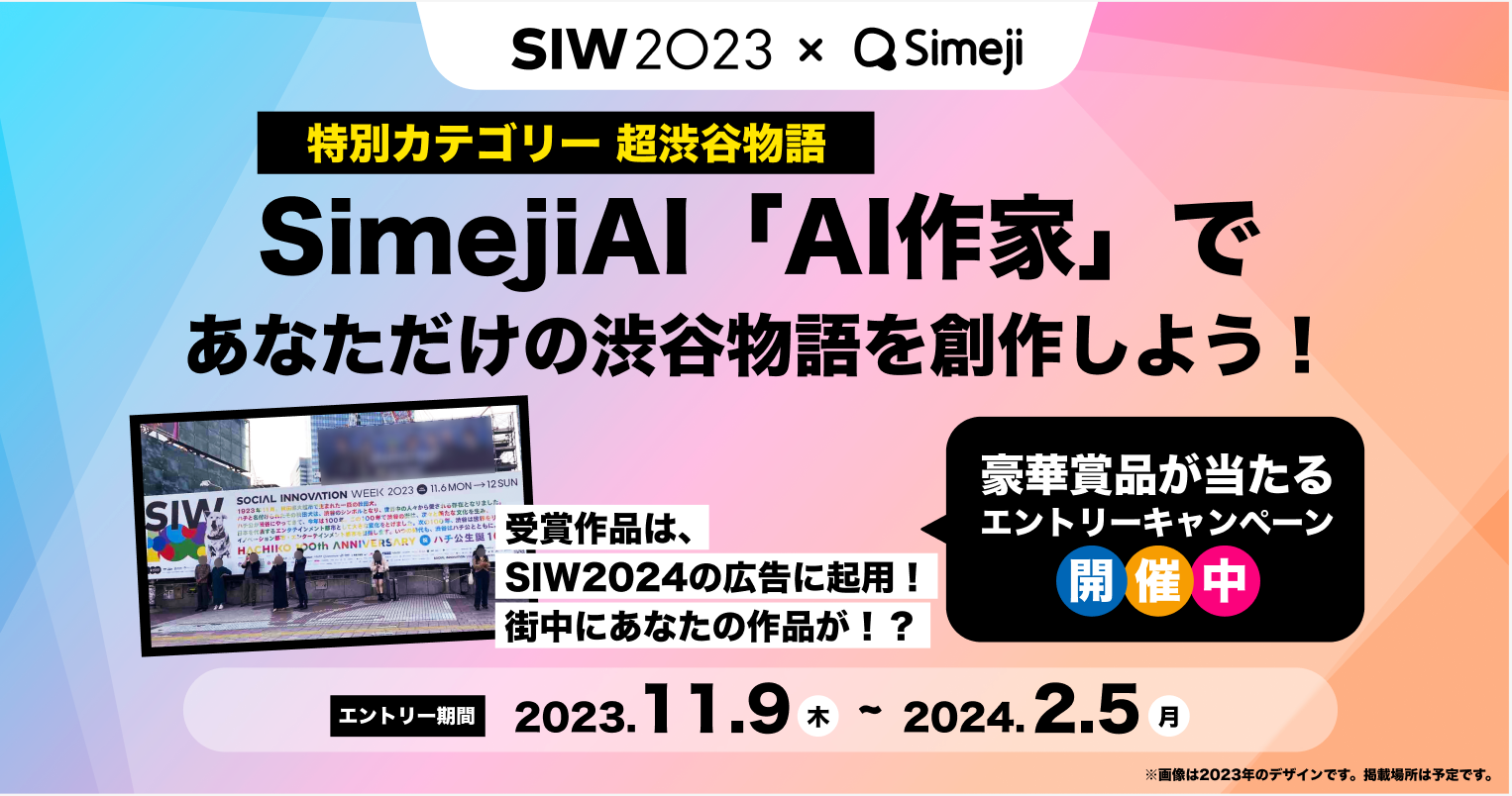 キーボードアプリ「Simeji」のSimejiAI『AI作家』機能は、あなたの創作活動を応援します。この機能を活用してあなただけの渋谷物語を創作し、エントリーしてください。『AI作家』にどんなキーワードをインプットするか、どんなジャンルの物語にするかはみなさん次第。YOU MAKE SHIBUYA STORY!