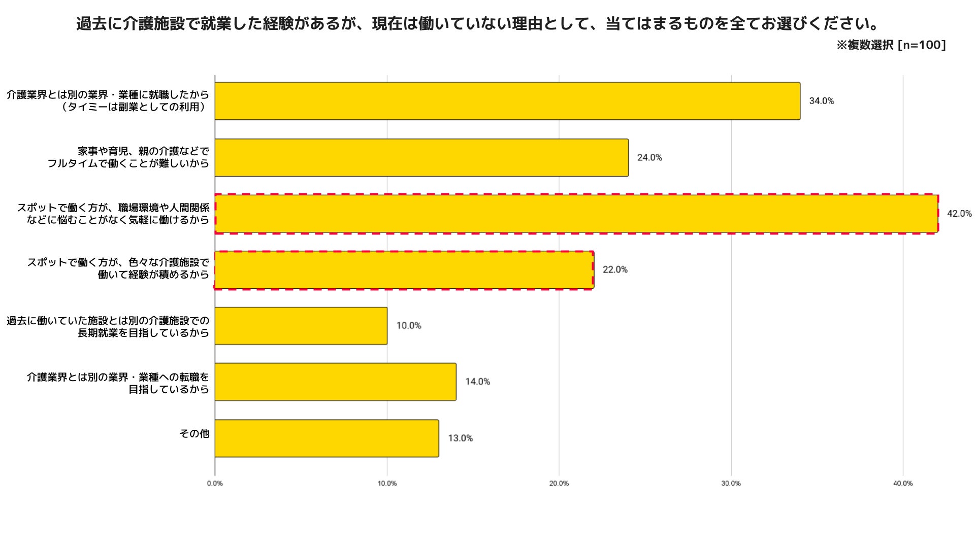 「過去に介護施設で就業した経験があるが、現在は働いていない(タイミーを通じたスポットワークのみ)」を選択した理由は、「スポットで働く方が、職場環境や人間関係などに悩むことがなく気軽に働けるから」が42.0%で最多。「スポットで働く方が、色々な介護施設で働いて経験が積めるから(22.0%)」という声も多く、「自分のペースで働ける」「色々な職場を経験できる」といったスポットワークの特性に魅力を感じている人が多いことが明らかになりました。