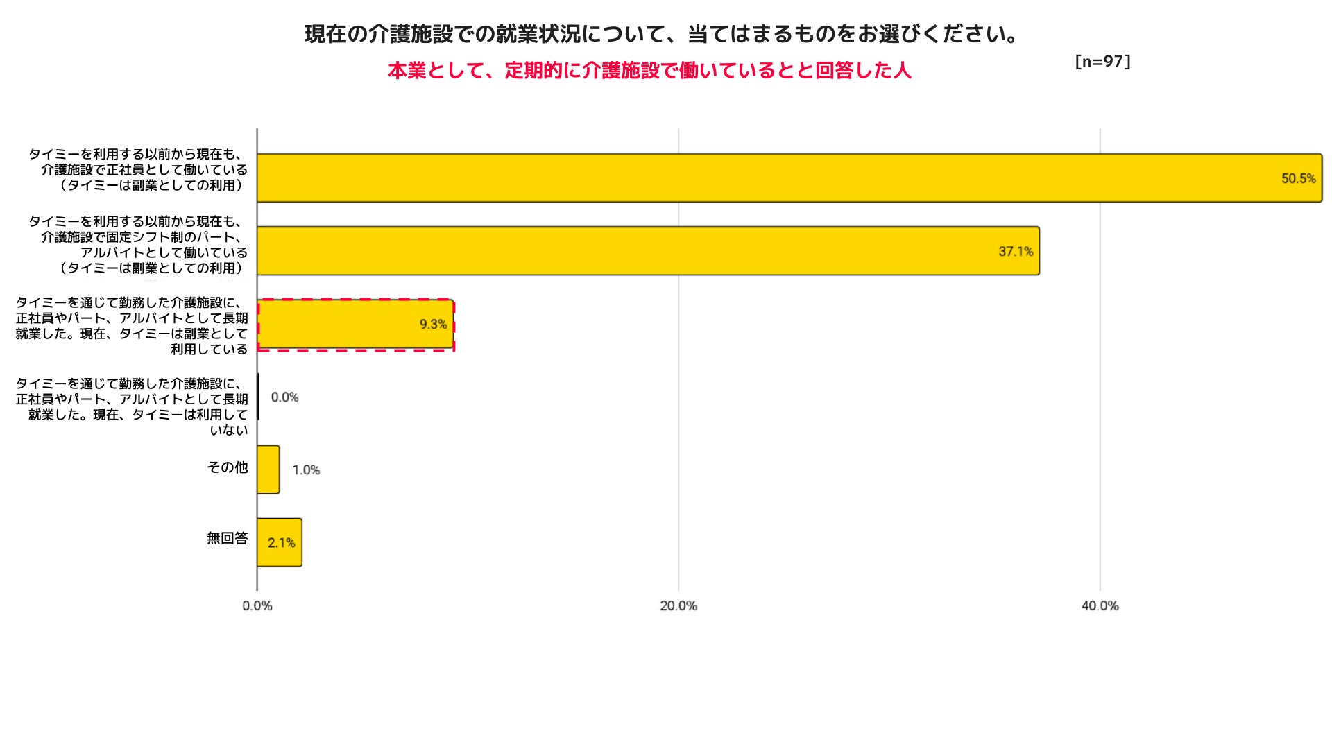 また、「本業として、定期的に介護施設で働いている(タイミーは副業としての利用)」と回答した現在の就業状況については、「タイミーを利用する以前から現在も、介護施設で正社員として働いている(タイミーは副業としての利用)」が50.5%と約半数を占めました。「タイミーを通じて勤務した介護施設に、正社員やパート、アルバイトとして長期就業した。現在、タイミーは副業として利用している」と回答した人は9.3%で、スポットワークをきっかけに介護事業者に長期就業し、現在も「タイミー」を通じてスポットワークを継続している人が一定数いることが分かりました。