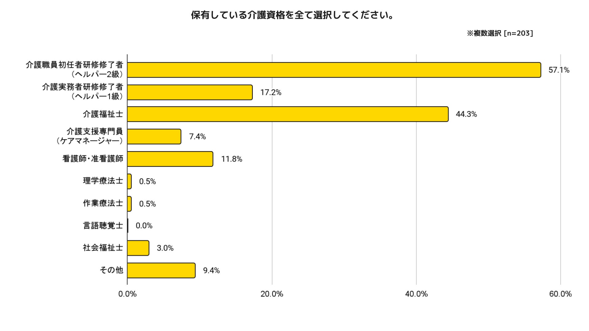 「タイミー」を通じた介護事業所でのスポットワーク経験者のうち、介護分野の資格を保有している人は約80%でした。保有している資格は入門資格とされる「介護職員初任者研修修了者(ヘルパー2級)(57.1%)」が最多で、次いで「介護福祉士」が44.3%。その他のフリーアンサーでは、「認知症介護実践者」や視覚障がいにより移動が困難な方の外出を支援する「同行援護介助者」の有資格者もみられました。