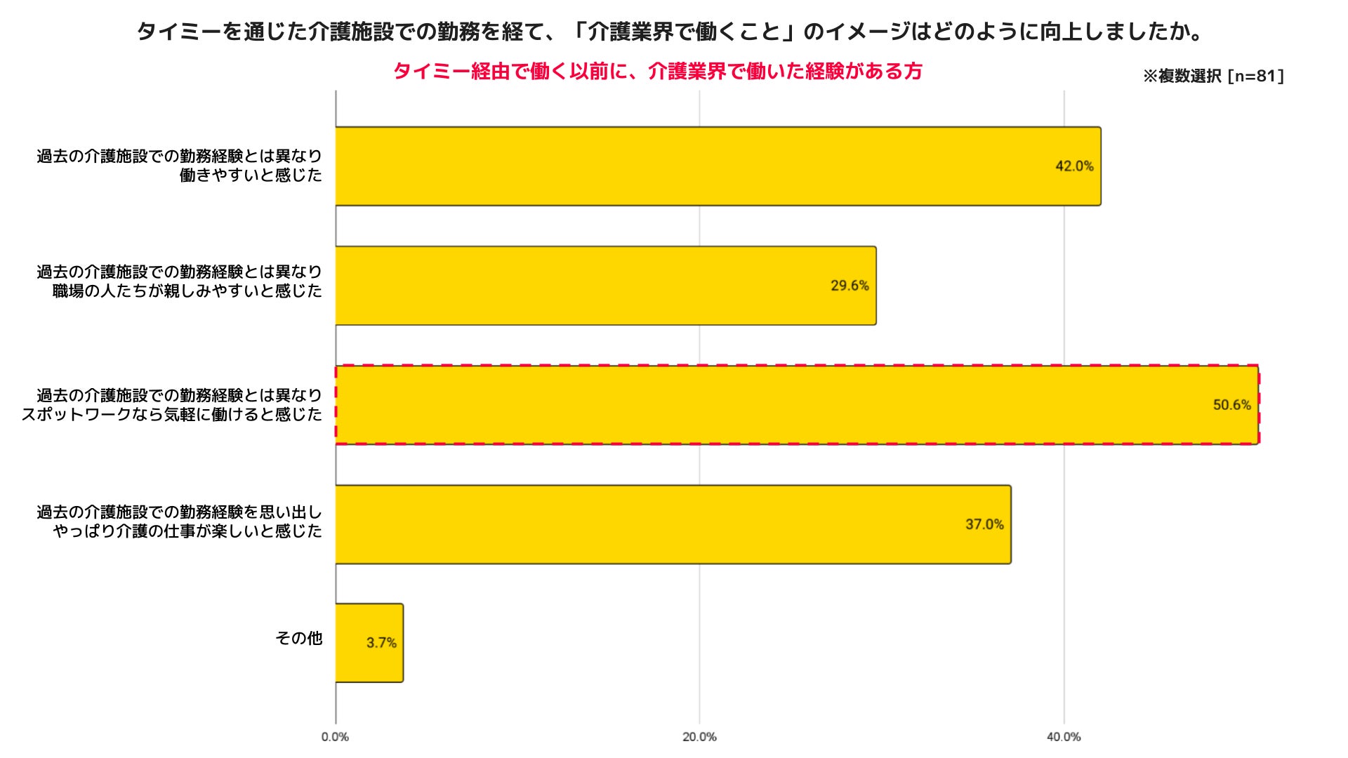スポットワークをする以前に介護施設で勤務した経験が「ない人」と「ある人」とにそれぞれに「どのように向上したのか」を確認すると、経験がない人は「勤務前に想像していた以上に自分にできる仕事がある(色々な仕事を任せてもらえる)と感じた」「勤務前に想像していた以上に働きやすいと感じた」「勤務前に想像していた以上に職場の人たちが親しみやすいと感じた」がいずれも51.6%で最多に。経験がある人は、「過去の介護施設での勤務経験とは異なりスポットワークなら気軽に働けると感じた(50.6%)」が約半数を占めたほか、過去の介護施設での勤務経験とは異なり働きやすいと感じた(42.0%)」や「過去の介護施設での勤務経験を思い出しやっぱり介護の仕事が楽しいと感じた(37.0%)」という声も多く寄せられました。