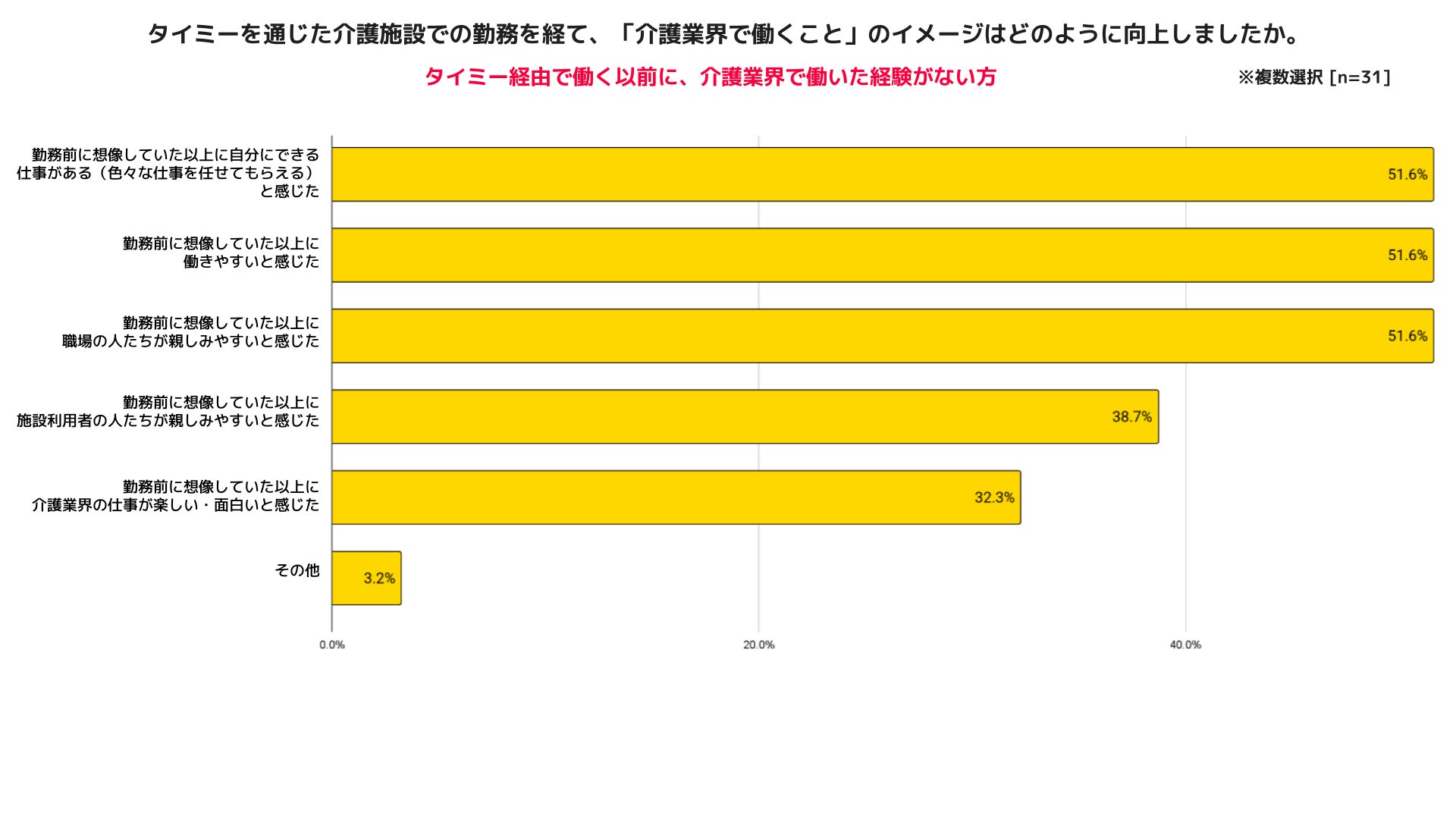 タイミーを通じた介護施設での勤務を経て、「介護業界で働くこと」のイメージが「向上した」と回答した人は44.3%。介護業界での就業経験がない人からは、「勤務前に想像していた以上に自分にできる仕事があると感じた(51.6%)」、就業経験がある人からは、「スポットワークなら気軽に働けると感じた(50.6%)」や「過去の介護施設での勤務経験を思い出しやっぱり介護の仕事が楽しいと感じた(37.0%)」などの声が寄せられた。