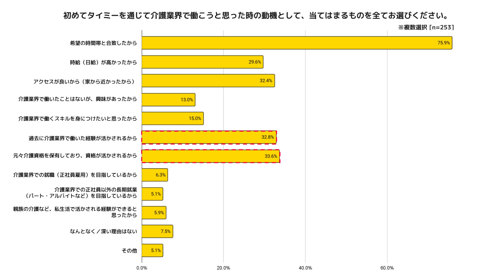 初めて働いた時の動機は、希望時間との合致に次いで「資格・経験が活かされること」が上位に
