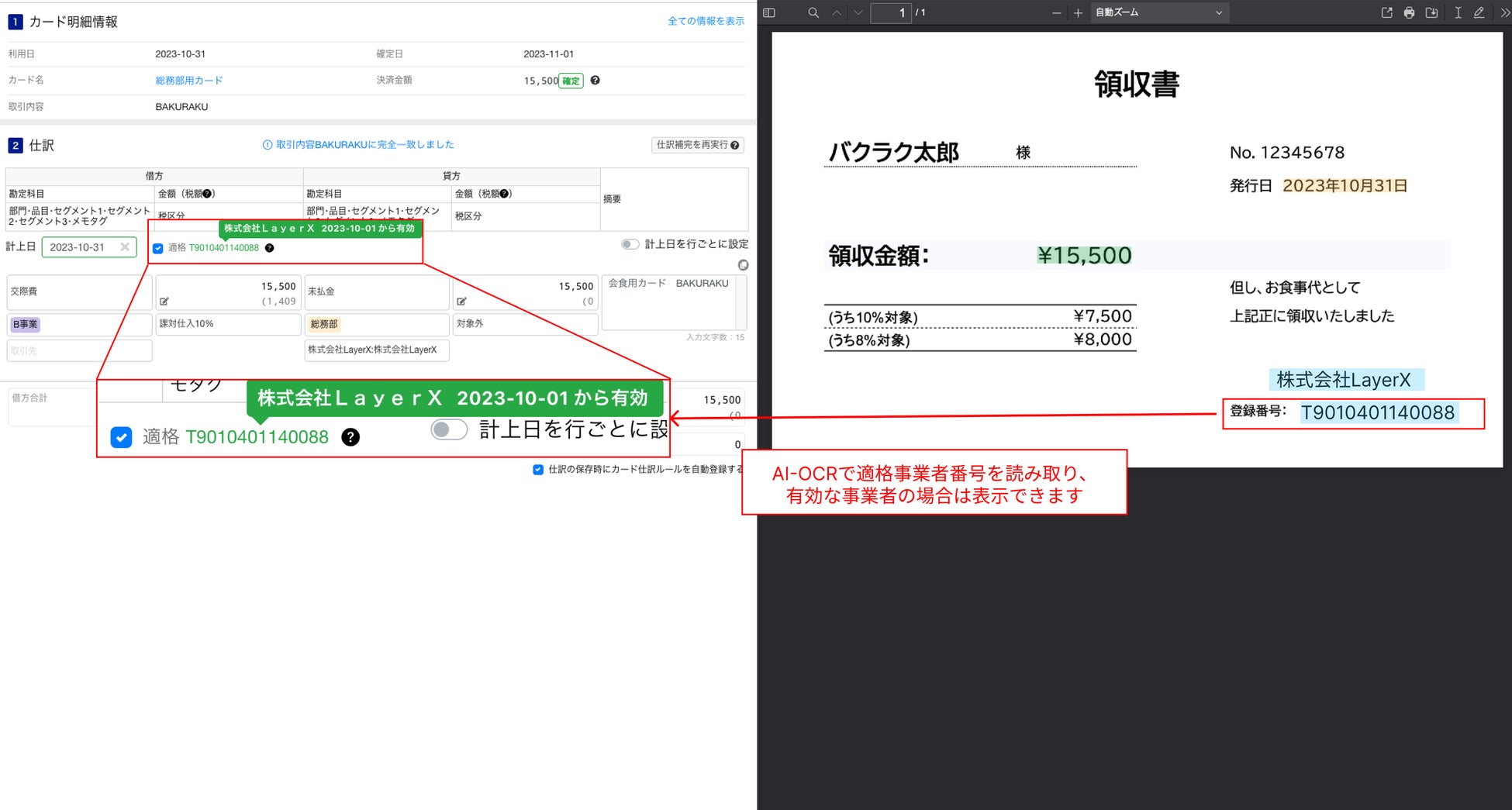 今回のアップデートでは、カード明細に対して添付された請求書または領収書上の登録番号を自動で読み取り、仕訳作成時に登録状況を判定する機能を追加しました。