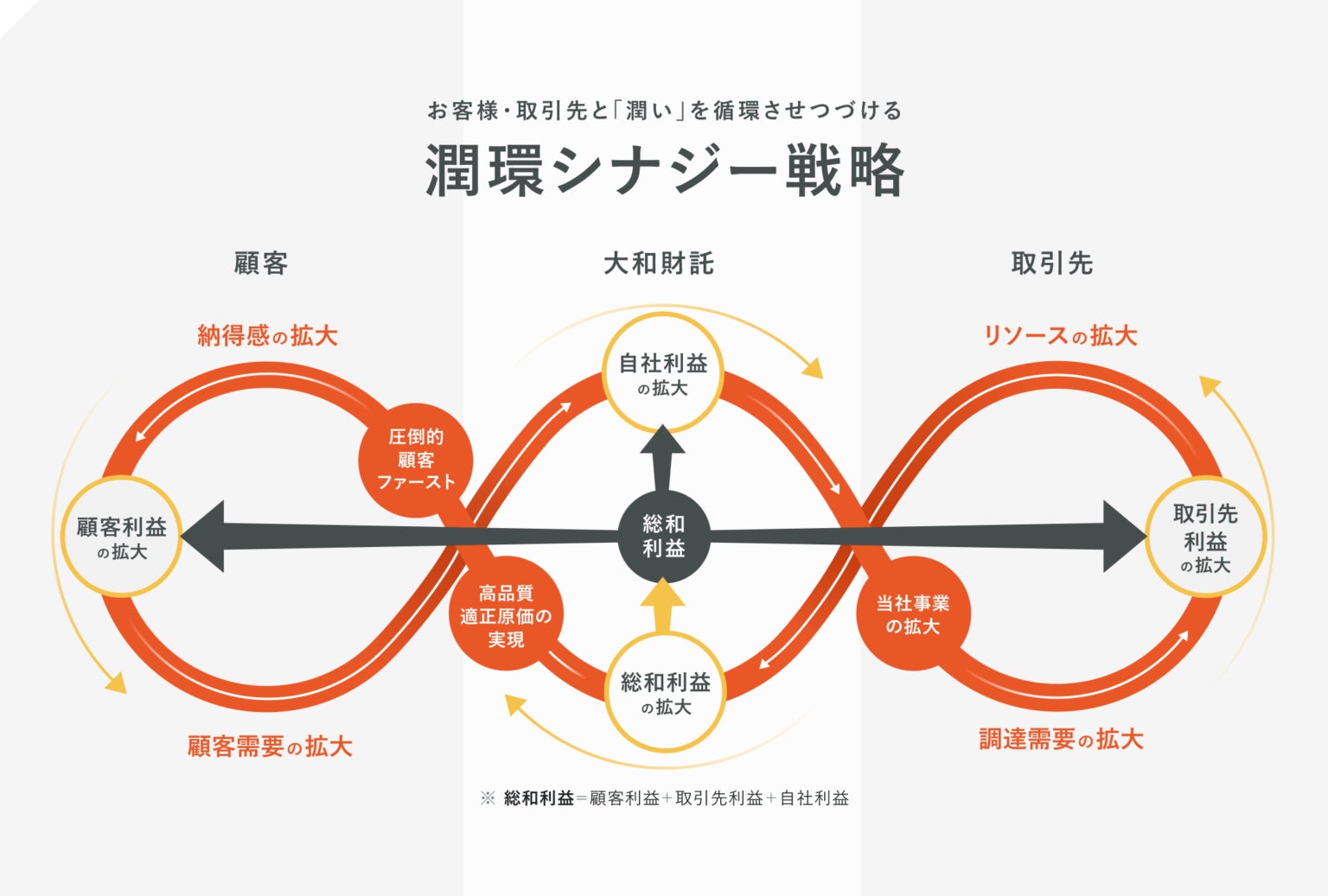 さらに、当社の成長戦略である「潤環シナジー戦略」によって、自社の利益を私たちとともに価値を創造し続けてくれる様々な取引先へ最適に分配し、より高いクオリティの仕事を生み出します。顧客を潤すことで当社に潤いが返ってくる、取引先を潤すことで当社にも潤いが返ってくる、社員を潤すことで社員も会社に潤いを返してくれる。顧客利益、取引先利益、自社利益、この3つの 「総和利益」 を適正にめぐらせてより大きな価値をともに生み出し続けます。