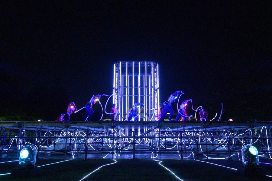 MPLUSPLUSが独自開発したLEDリボン、LEDマスク、LED傘、LEDフラッグなど、光り輝くアイテムを使って10名のパフォーマーが、LINK TOWERを舞台にダンスパフォーマンスを披露します。時代と共に進化してきたダンスが、現代のテクノロジーで更に覚醒したパフォーマンスは圧巻です。
