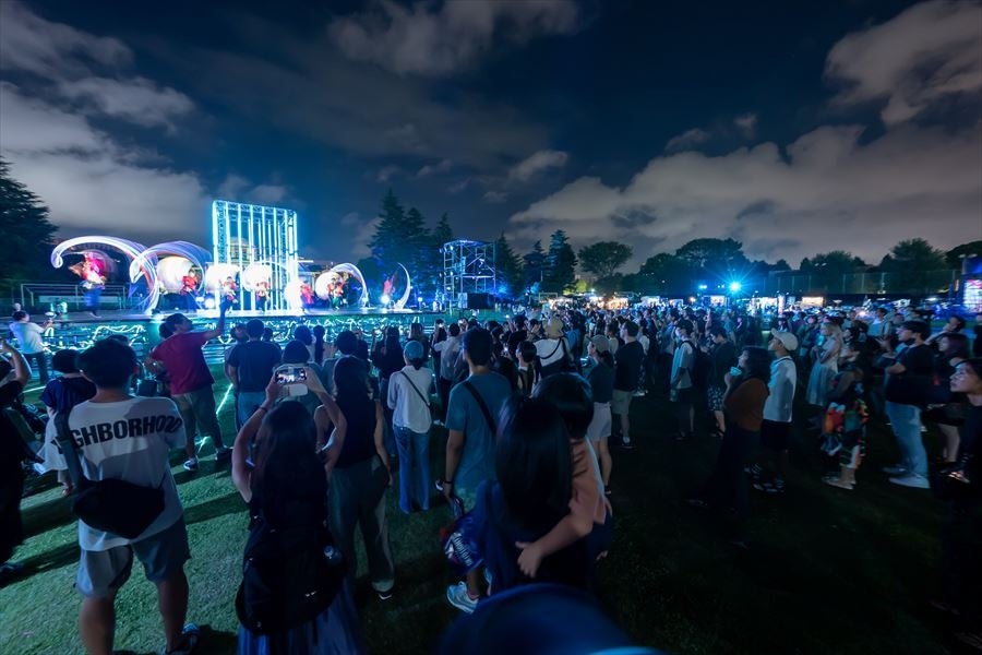 MPLUSPLUSの藤本実氏制作による「分断された世界を繋ぐ光」をテーマにしたインスタレーション。東京の高層ビル群と広範な地下鉄線路を表現した光の塔が、光の祭典エリアの象徴としてそびえ立ちます。ステージから広がる光が、観客に希望と創造性を想起させます。