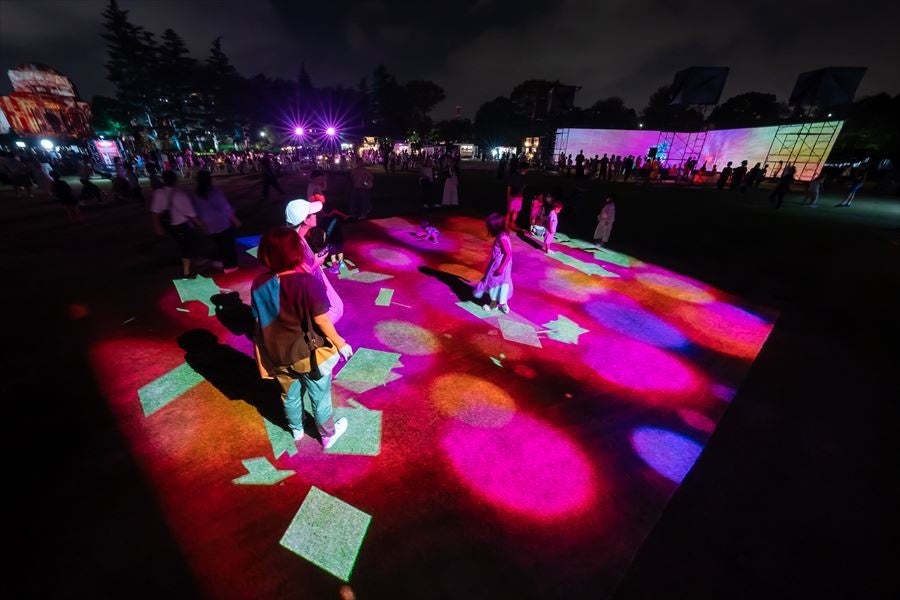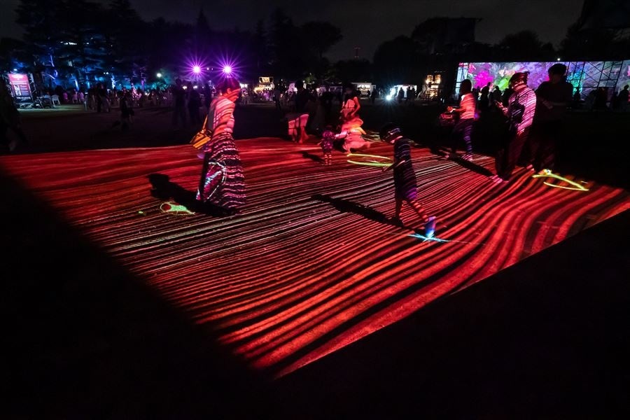 レーザーセンサーとプロジェクションマッピングを組み合わせることにより、様々なインタラクションが発生します。人の動きに合わせて模様がついてきたり、映像の色が変化したりして、楽しむことができます。凹凸のないバリアフリーな芝生は、子供から大人まで楽しめるみんなの夜の遊び場です。