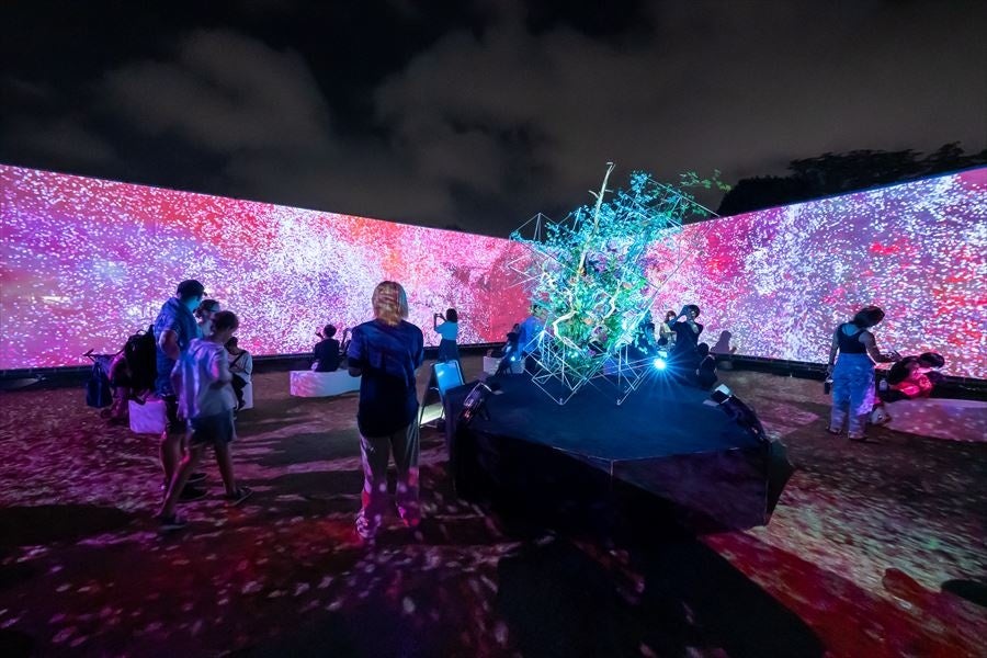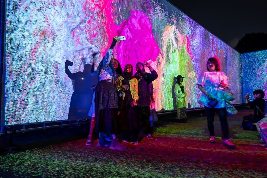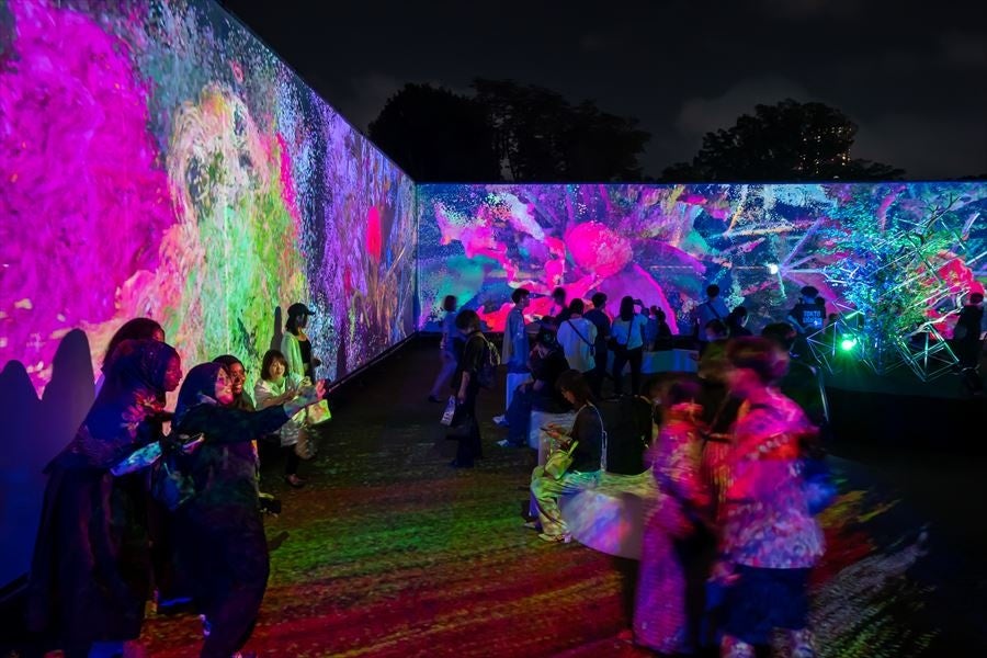 THINK AND SENSEの松山周平氏の制作により、幅15m×2面・高さ4mの巨大な壁が作り出すイマーシブ(没入)空間に、点群データとAIによる3D映像生成技術で伝統や自然を表現。9月開催では、華道家元池坊の「重陽の節句」が題材のいけばな作品との連動により、空間全体で体験を作り出します。