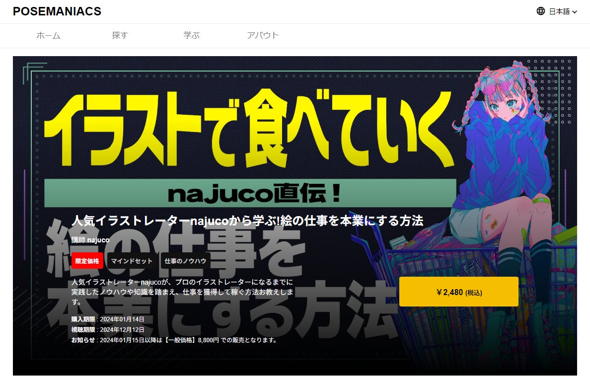 出現画廊が開発した『絵で稼ぐため』に必要なコトを学べる動画教材を、ポーズの描き方が学べる人気サイト「POSEMANIACS」で発売開始いたします。連携販売を記念して期間限定価格で販売するキャンペーンを実施し、プロのイラストレーターを目指す方々の新しい学びを応援いたします。