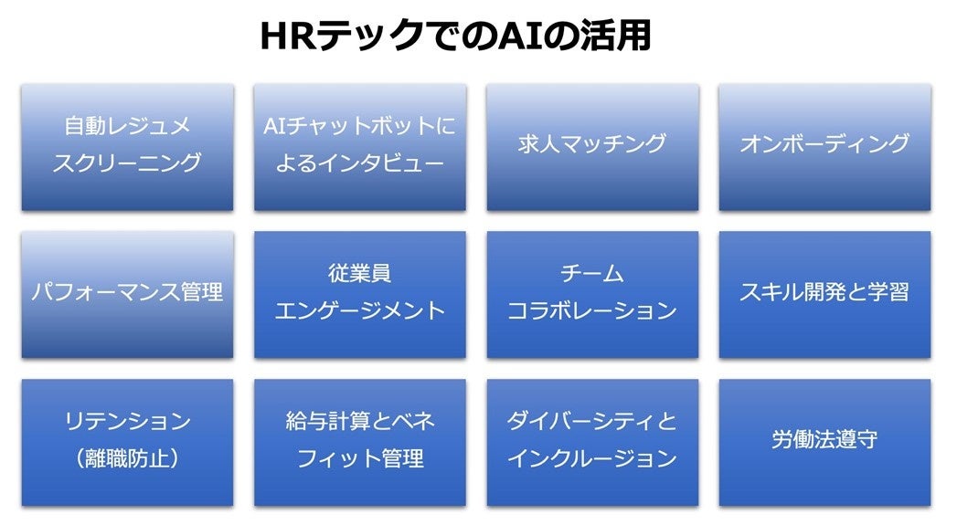HRテックにおけるAIの活用は非常に広範で、採用からオンボーディング、パフォーマンス管理、従業員のエンゲージメント、スキル開発、退職管理まで多岐にわたります。以下にその一部をご紹介します: