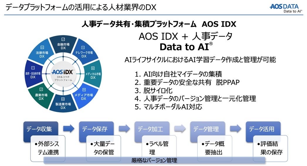 AOS IDXでは、こうしたAIライフサイクルの仕組みとマルチモーダルAIへの適用に基づき、AIデータにおけるAIシステムのためのAIデータ管理を行い、企業における優秀なデータがあって初めて優秀なAIシステムを実現できるというData to AIのコンセプトの元、AOS IDXによって、人事の効率向上、リスクの最小化、持続可能な運営を実現向けたプラットフォーム構築を支援します。