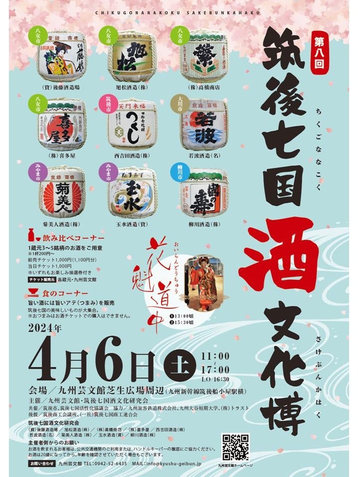 矢部川流域の9つの酒蔵(後藤酒造場・旭松酒造・高橋商店・喜多屋・西吉田酒造・若波酒造・菊美人・玉水酒造・柳川酒造)で構成される筑後七国酒文化研究会が、新酒が勢ぞろいした4月に九州芸文館芝生広場に大集結!!