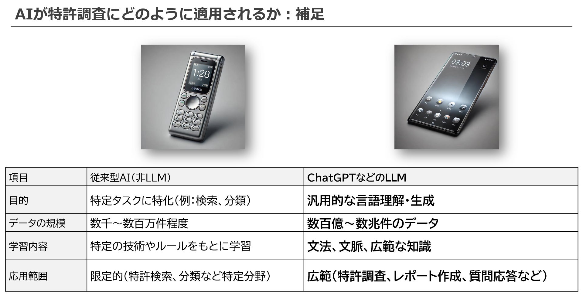 現在に至るまでAIの技術は大きく発展してきましたが、今後はLLM以前の技術についてはもはや考える必要はないと考えています。なぜなら、LLMはこれまでのAI技術と比べて、拡張性の高さが段違いだからです。特許調査における、従来型AIとChatGPTのようなLLMを比較すれば、その違いは一目瞭然です。