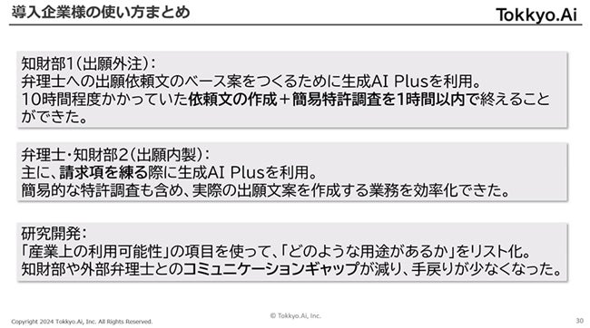 弊社のプライベートAI特許をローンチしてから1年半以上になりますが、これまでに知財部や弁理士、研究開発部門の方々にご利用いただいております。その結果、数百社以上の企業・研究機関様に導入いただいております。導入企業様ごとに使い方は異なり、その中で見えてきた効率的な使い方をご紹介します。