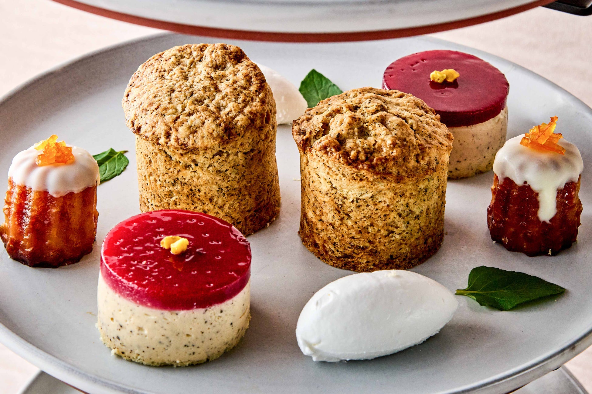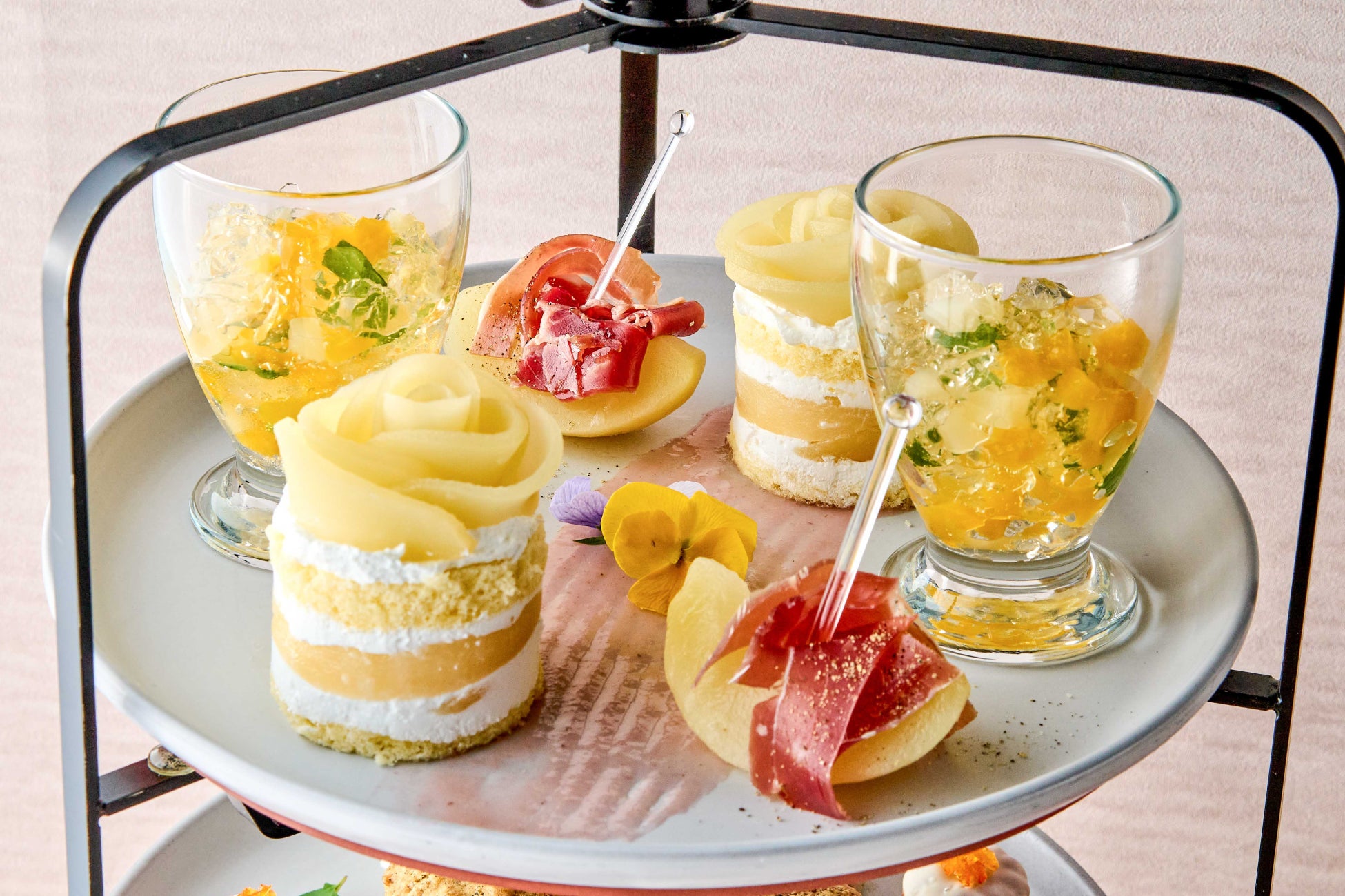 今回は、初夏にぴったりなみずみずしい桃を使用した3品が上段に並びます。桃の優しい甘さが引き立つショートケーキ、桃とワインの風味が香るゼリー、マリアージュがたまらない桃と生ハムをご用意。中段には、アールグレイが口いっぱいに広がるムースとスコーンを。 セイボリーには、イトヨリ(鯛)のマリネとバジルソースがアクセントのカナッペをお楽しみください。