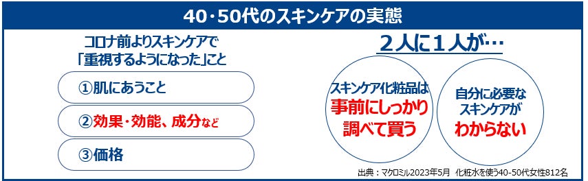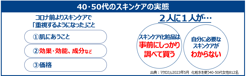 当社が実施した調査では、40-50代の方へ向け、ここ数年のスキンケアに関する変化についてたずねたところ、「効果・効能」や「成分」を重視するようになった、と感じている方が多いことがわかりました。また、2人に1人が「スキンケア商品は事前に情報をしっかり調べて買う」と答える一方で、同程度の方が「自分の肌に必要なスキンケアがわからない」と感じている現状も見えてきました。