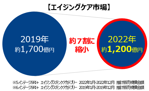 エイジングケアカテゴリーは、年間約1,200億円※5を超え、スキンケア市場において33%※5を占める巨大カテゴリーです。国内の人口比率からみても、今後も需要が高いカテゴリーと考えられる一方、2019年同期比では約7割に縮小※6しています。