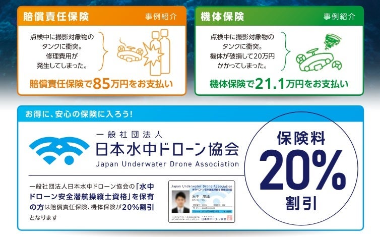 また資格取得者には賠償責任保険や機体保険に割引料金で加入できるなど、初めての方でも水中ドローンを安心して運用いただけます。