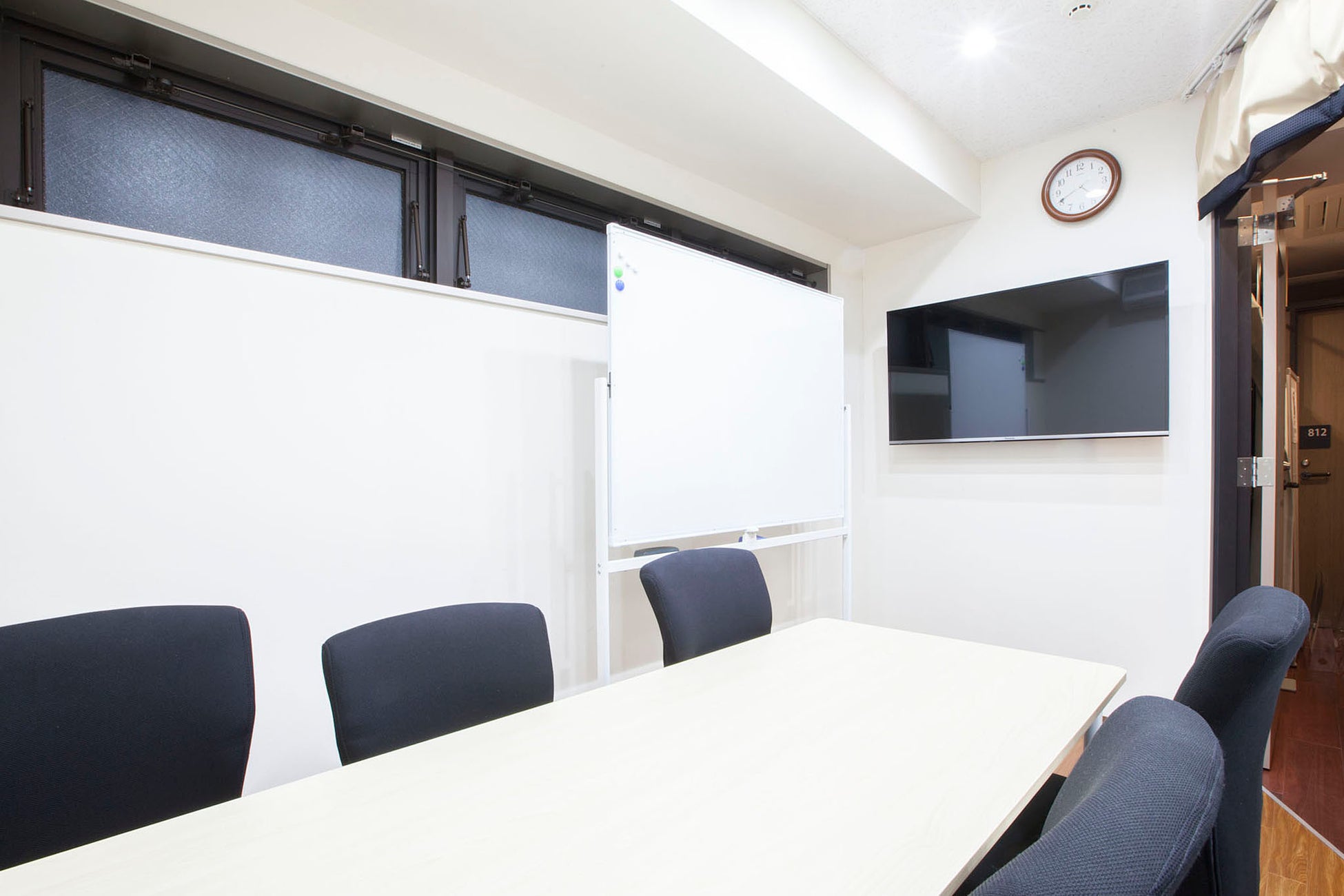 最大6名で利用可能な会議室。モニターやホワイトボードがあり、商談から社内ミーティング、ワークショップなど、さまざまな用途でご利用いただけます。