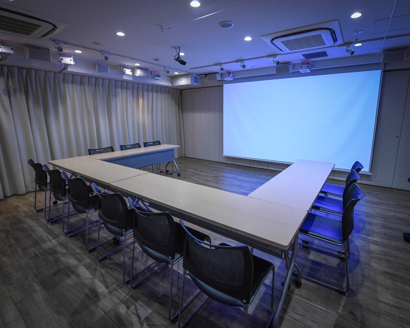 最大50名で利用可能なイベントスタジオ会議室。大型スクリーンも完備しているため、セミナー開催も可能です。