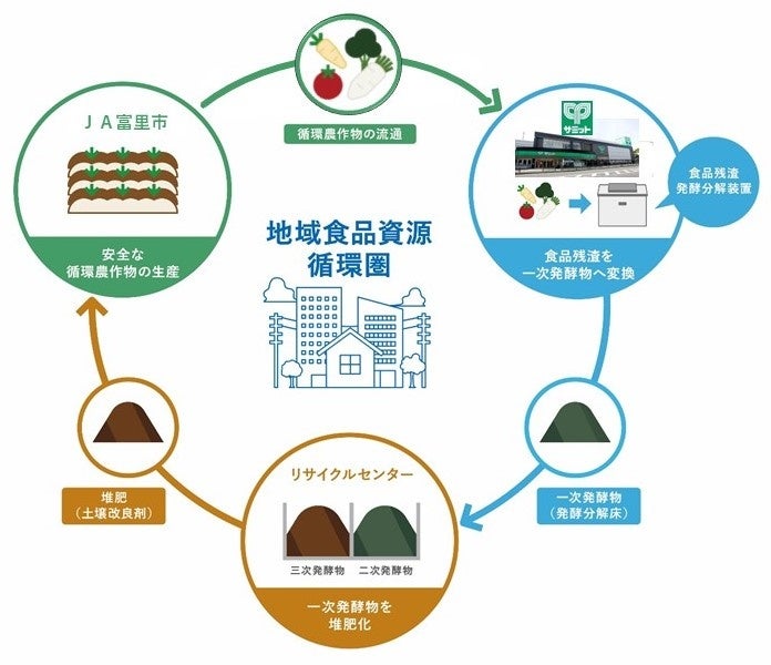 サミット株式会社(本社:東京都杉並区、代表取締役社長:服部哲也、以下、サミット)は、NTTビジネスソリューションズ株式会社(本社:大阪府大阪市、代表取締役社長:上原一郎、以下、NTTビジネスソリューションズ)が提供する「地域食品資源循環ソリューション」を活用し、サミットストアの店舗で発生した食品残渣を食品残渣発酵分解装置で処理しています。この度、新たに富里市農業協同組合(以下、JA富里市)さまの協力を得て、サミットから排出される食品残渣を用いて作られた堆肥を使用して生産した野菜の販売を、4月1日よりサミットストア世田谷船橋店にて開始しました 。これにより、「食品資源循環」の最後のステップが繋がり 、その循環の中で生産された野菜を店舗で提供することが可能になりました。