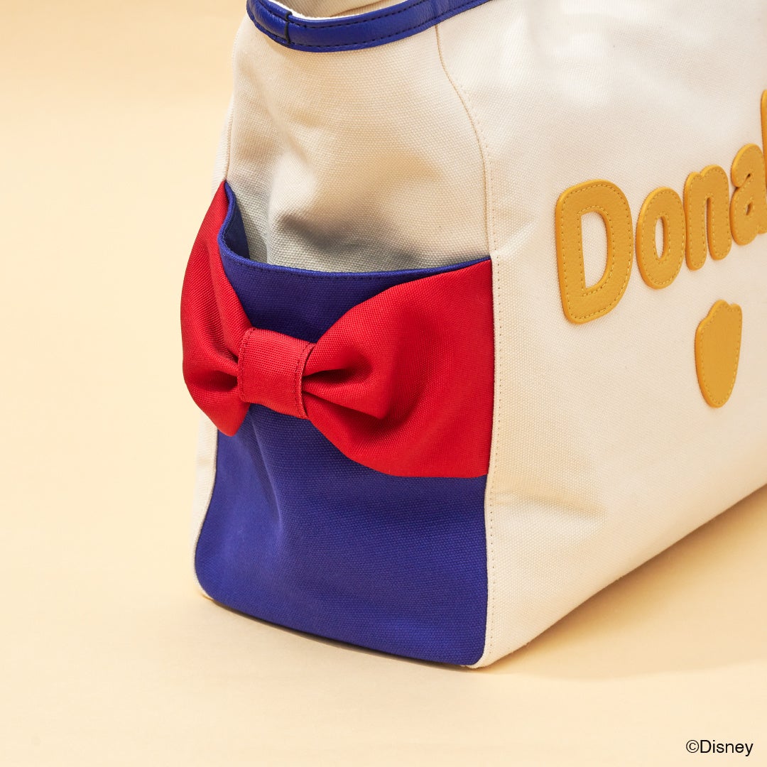 「ドナルドダック」のお洋服を連想させるブルーカラーと赤いリボンをバッグにデザインしたアイテム。両サイドにデザインされた赤いリボンは、「ドナルド」が着用しているセーラー服と一緒にコーディネートしているリボンをイメージ。