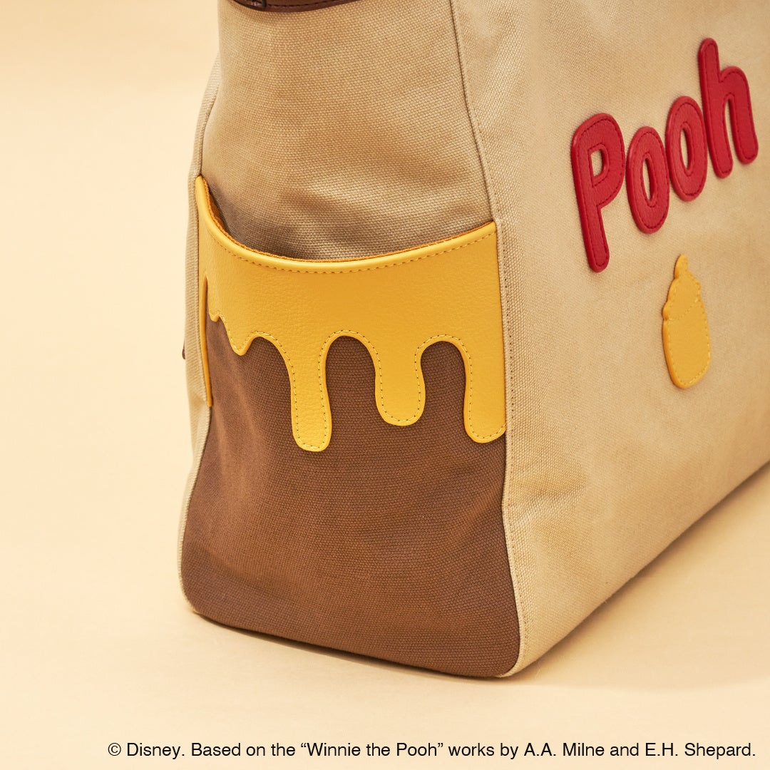 「プー」も喜びそうなたっぷり垂れたはちみつのデザインが、キャラクターの世界観を感じる仕様に。はちみつの壺をイメージしたブラウンを持ち手やサイドポケットに配色することで、『くまのプーさん』の世界観に引き込まれそうなワクワクするデザインに。