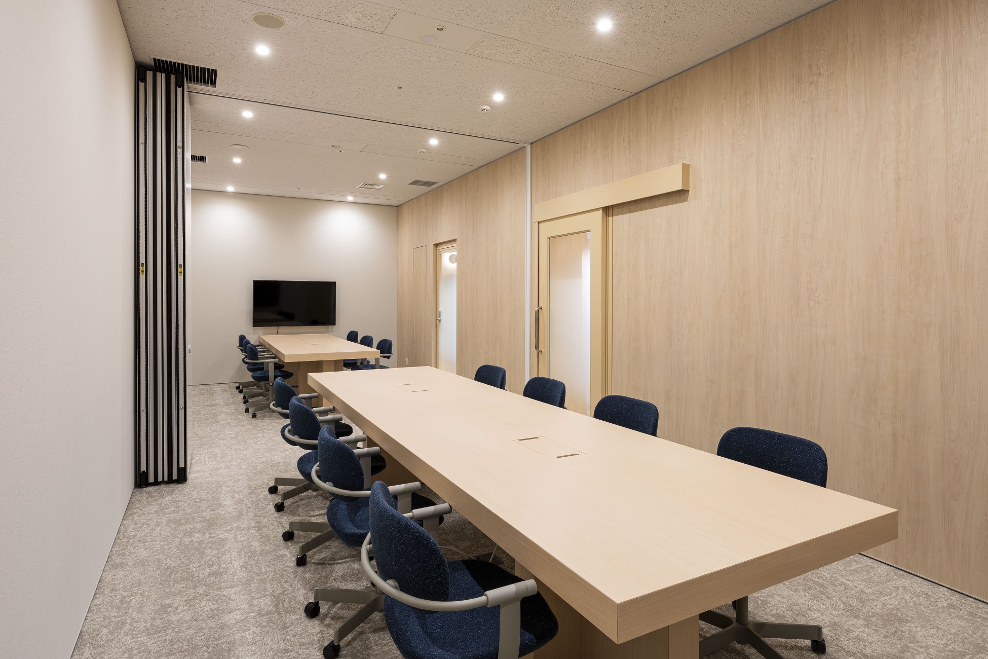 4名から10名用まで、大小5室のミーティングルームを新設しました。可動パーテーションを開放することで最大14名の打ち合わせに対応可能です。中央の「ひろばラウンジ」は家具のレイアウト変更により、20人~30人規模のイベントスペースとしても利用できます。各会議室はQRコードから簡単に予約できるシステム「Airリザーブ」を導入しました。ランチタイムはラウンジエリアの予約を制限し、多くの人が利用できるよう工夫するなど、柔軟かつスムーズな運用を実現しました。